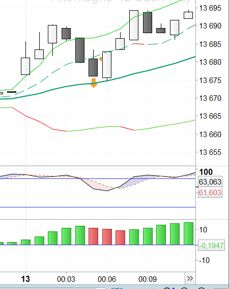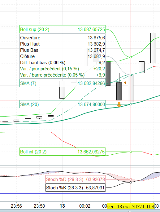 Ci-dessous un exemple: un short a été ouvert et le trade “aurait” dû etre cloturé à 13 675 lorsque le cours touche la BB sur la bougie suivante.
