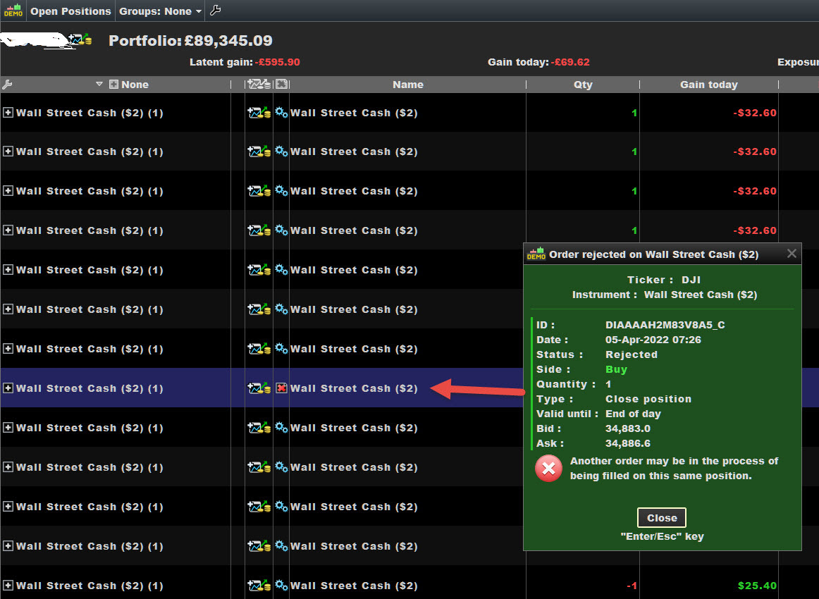 IG appear to have done something, or maybe it was the many attempts I had at killing it! The System is now no longer in the running window, but the trade is still open – like a manual trade with a red cross – but I can’t close it.