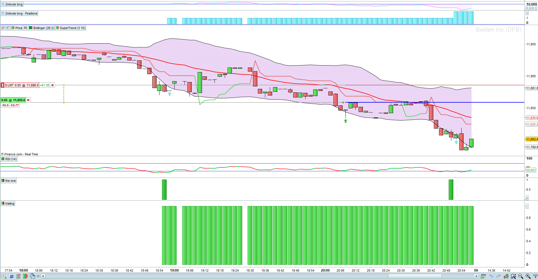 Instrument: Belden Inc. Long signal (29/9/25) on 30min at 17:00 candle close (value 12141). Subsequent long signals (3/10/25) both on 2min at 18:56 candle close (value 11876.5) and again at 20:50 candle close (value 11805)