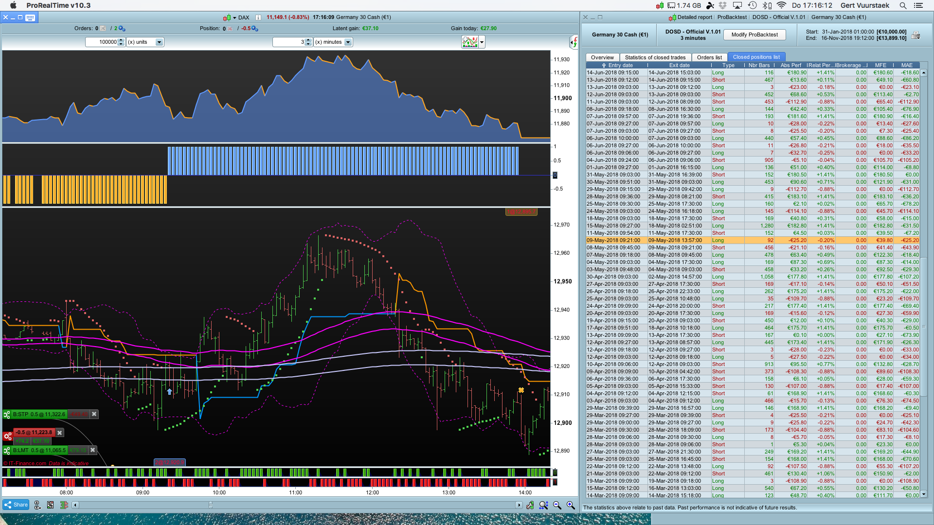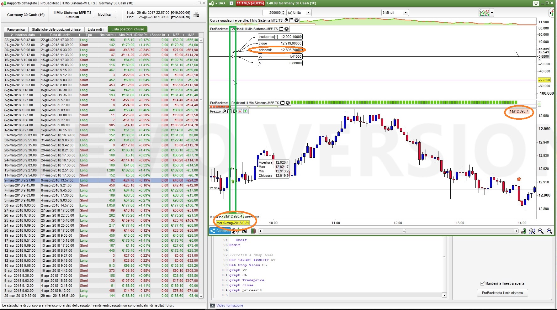 On the 9th of may 2018 at 9:21 on the Germany 30 Cash (€1)(3min) a Long trade is entered for a price of 12,920.9. At 11:39 a first temporary top is reached at 12,960.7 (closing price). A difference of 39.8 points.