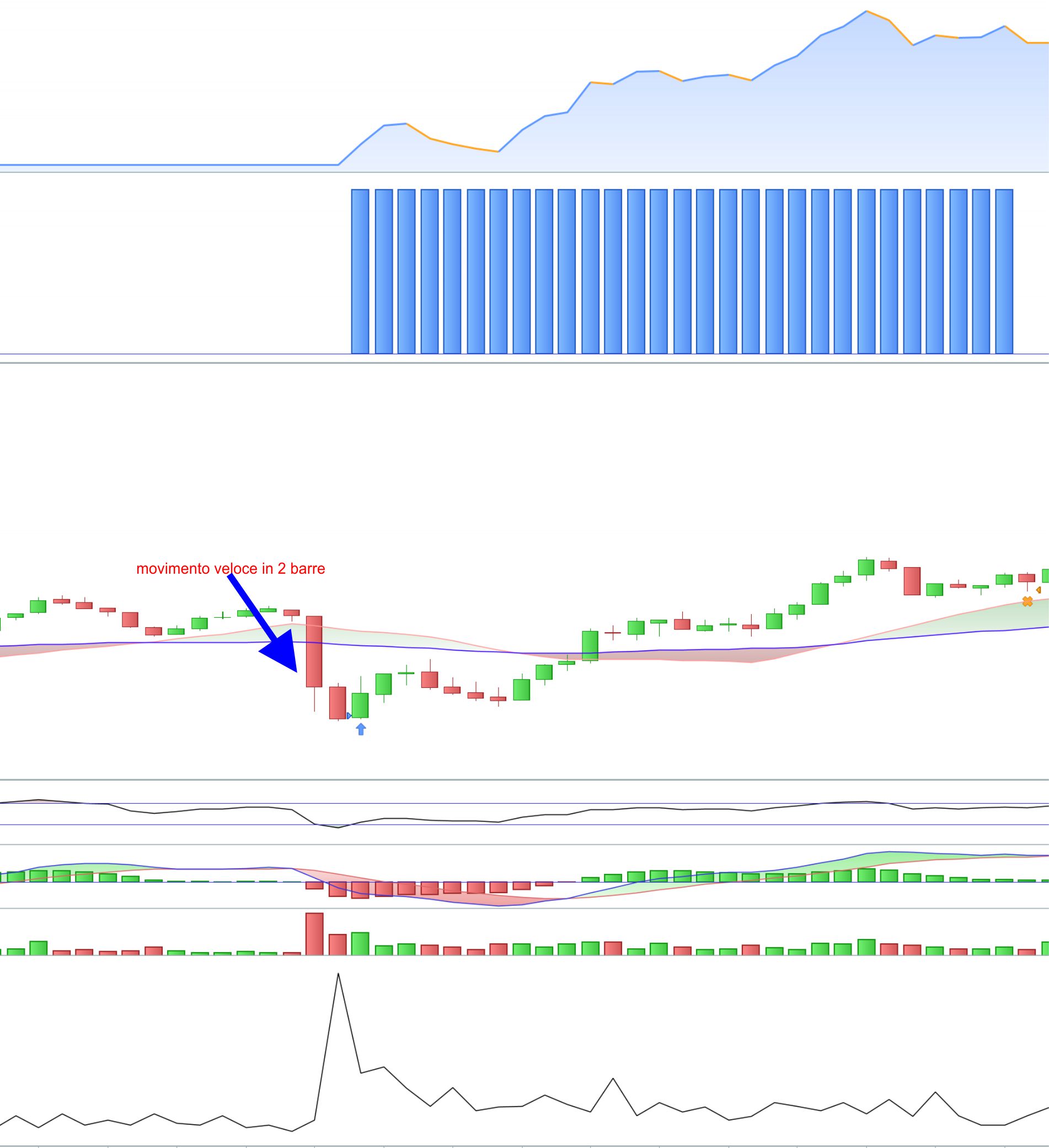 - Se l’escursione è positiva, vende 1 contratto con target price al prezzo minimo delle N candele * coeff (variabile).