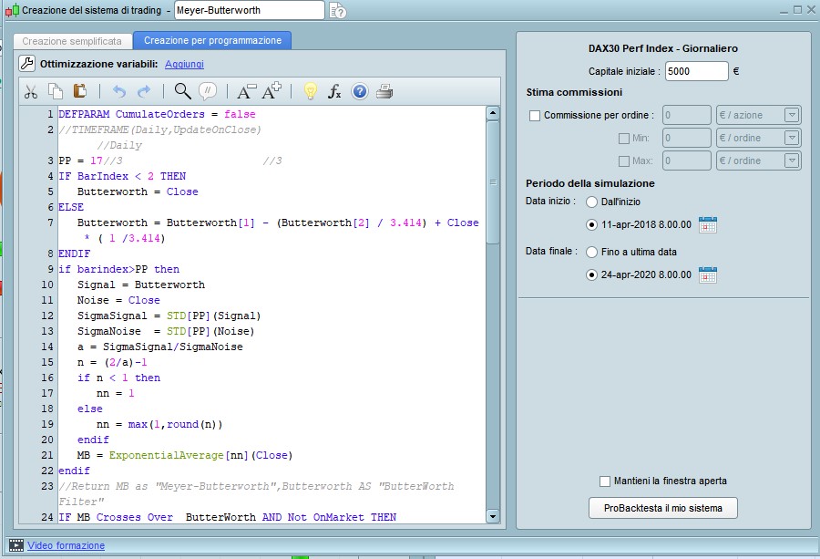Ho provato di nuovo il sistema con timeframe giornaliero, mettendo esattamente le date sulle quali ha provato lei, 11 aprile 2018 – 24 aprile 2020.