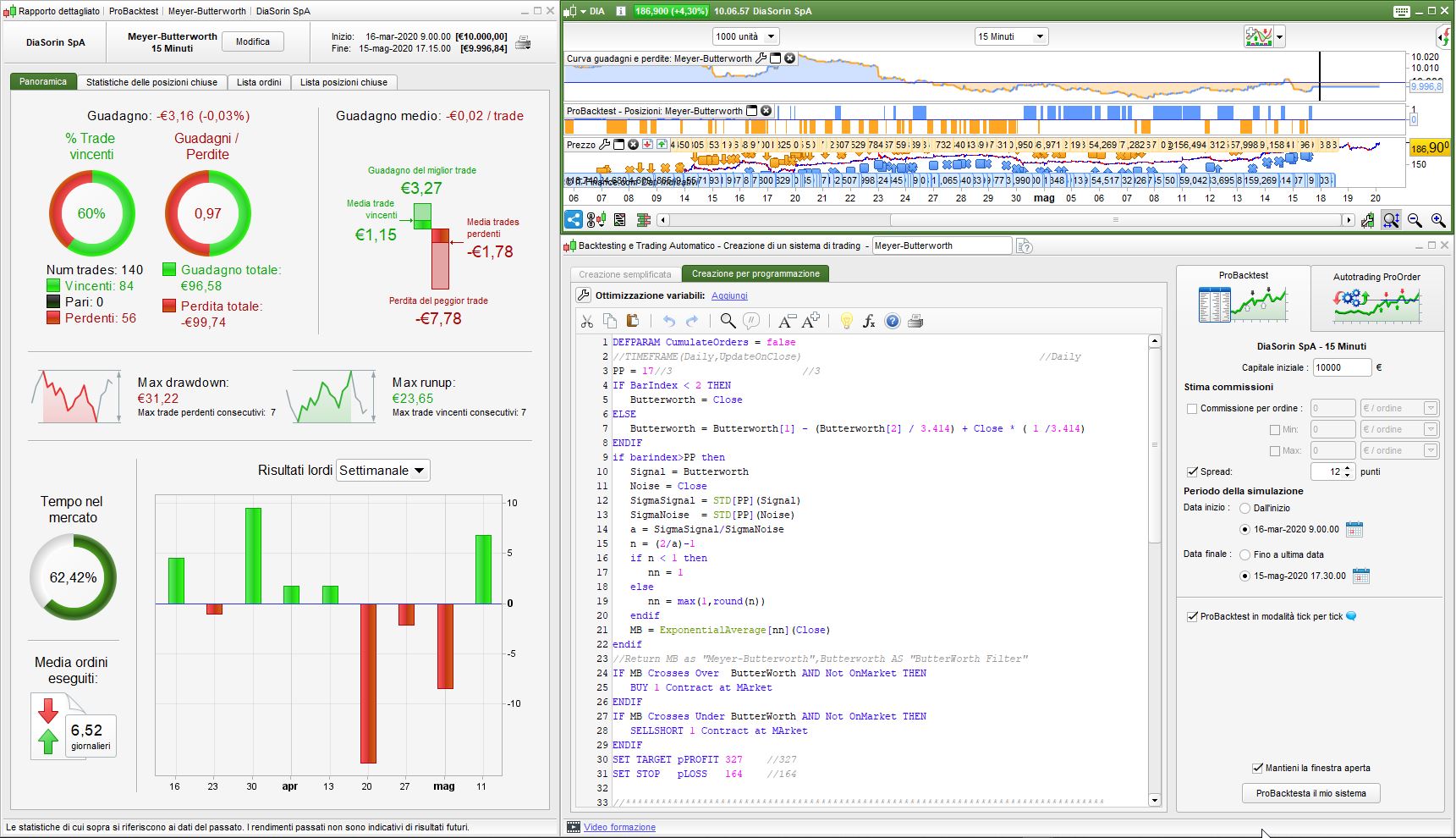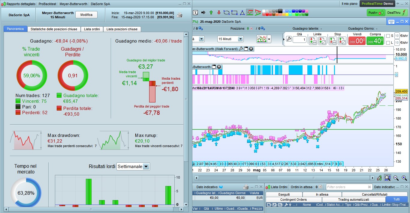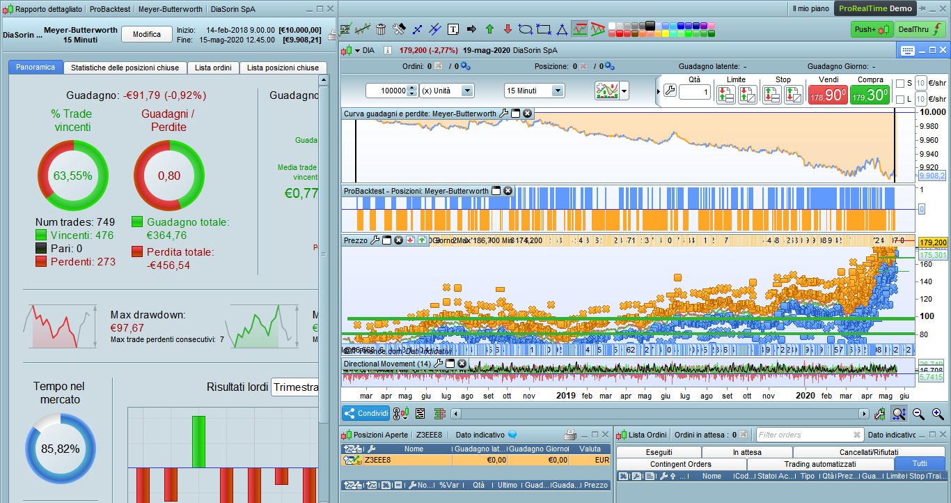 Stesso sito IG, piattaforma ProRealTime 10.3, stesso strumento DIASORIN Spa, stesso TF 15 minuti, stesso numero di unità 100.000, stesso capitale iniziale 10.000 €, stesso spread 12 pip, stesso inizio 14 febbraio 2018 ore 9.00, stessa data di fine 14 maggio 2020 ore 12.45, tick per tick attivato, stesso codice (che mi ha dato lei).