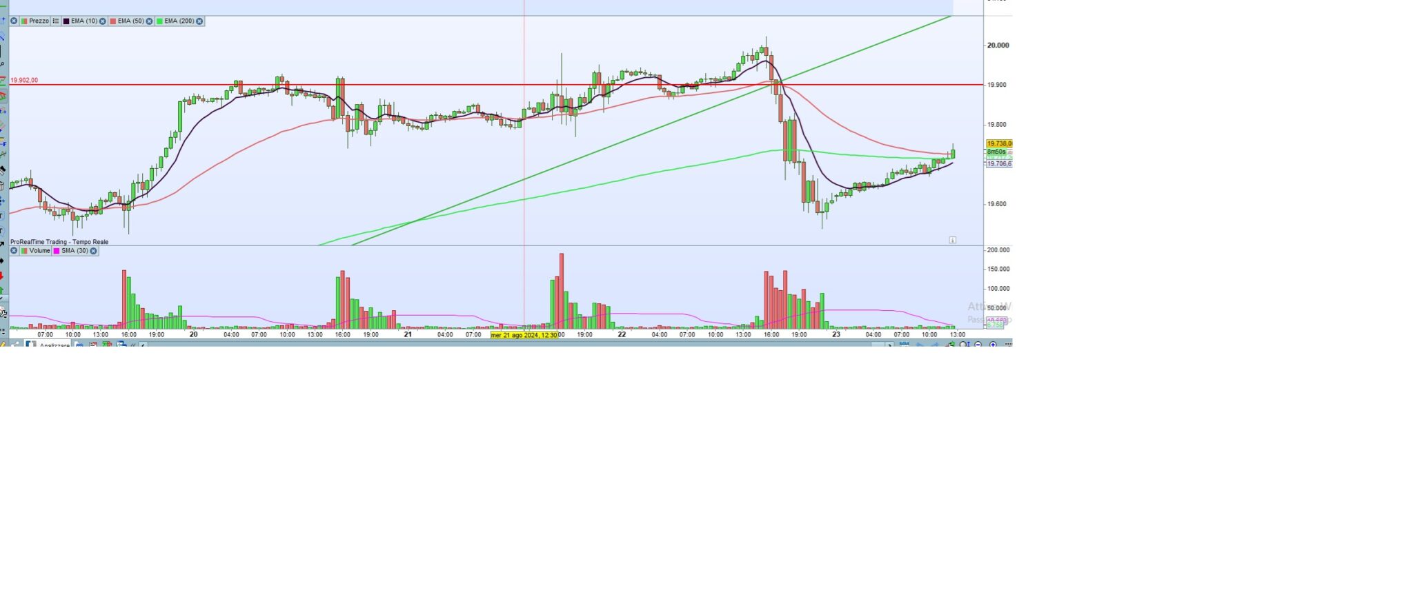 l’idea alla base è che il prezzo stia sotto l’EMA200 per un tot di candele (100 o + per l’esattezza), poi crossi in su l’EMA200 e ritorni giù in dopo essere stato massimo 5 candele sopra l’EMA 200.