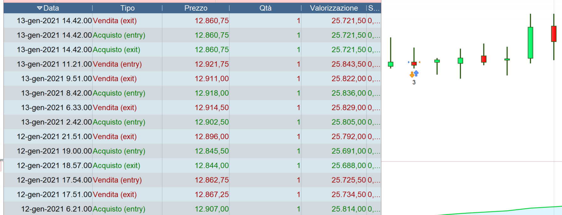 La prima sembrerebbe uno Stop & Reverse, cioè viene chiuso lo Short si apre un Long che però viene chiuso sulla stessa candela, il secondo è un’entrata Long.