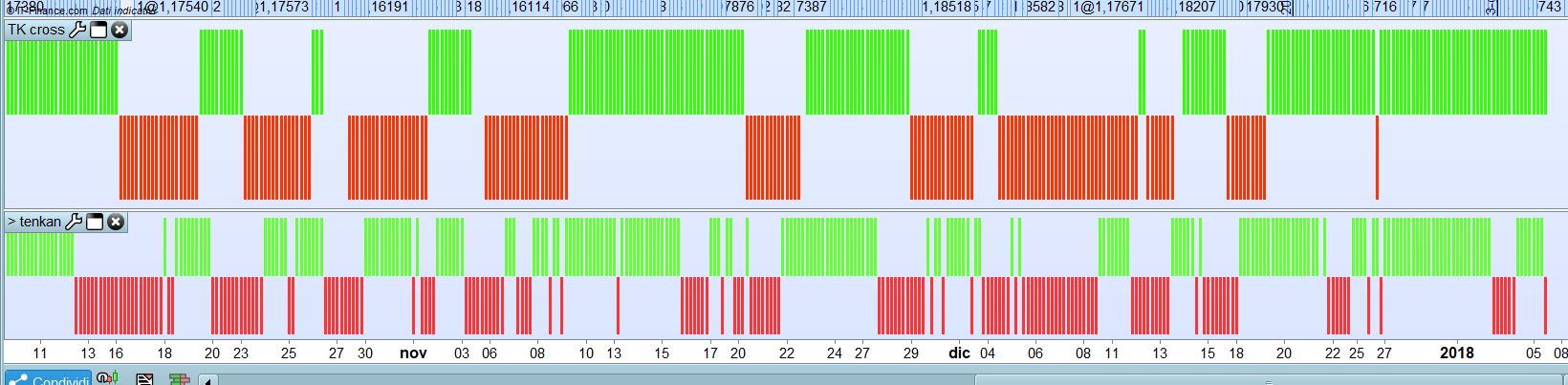 Io sto cercando di sviluppare un trading system basato sull’ichimoku,in pratica la strategia prevede di entrare ,ad esempio long,dopo un segnale di incrocio della media mobile veloce (tenkan) con la media mobile lenta (kijun) dopo che il prezzo abbia rotto al rialzo il massimo delle ultime 26 barre.la posizione viene poi chiusa quando il prezzo attraversa la tenkan oppure la kijun.
