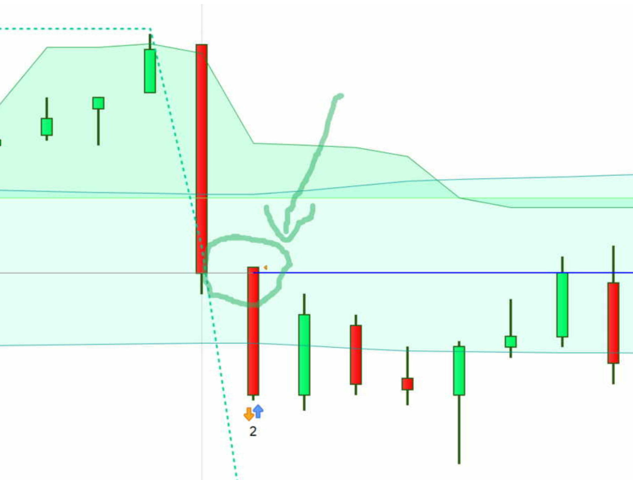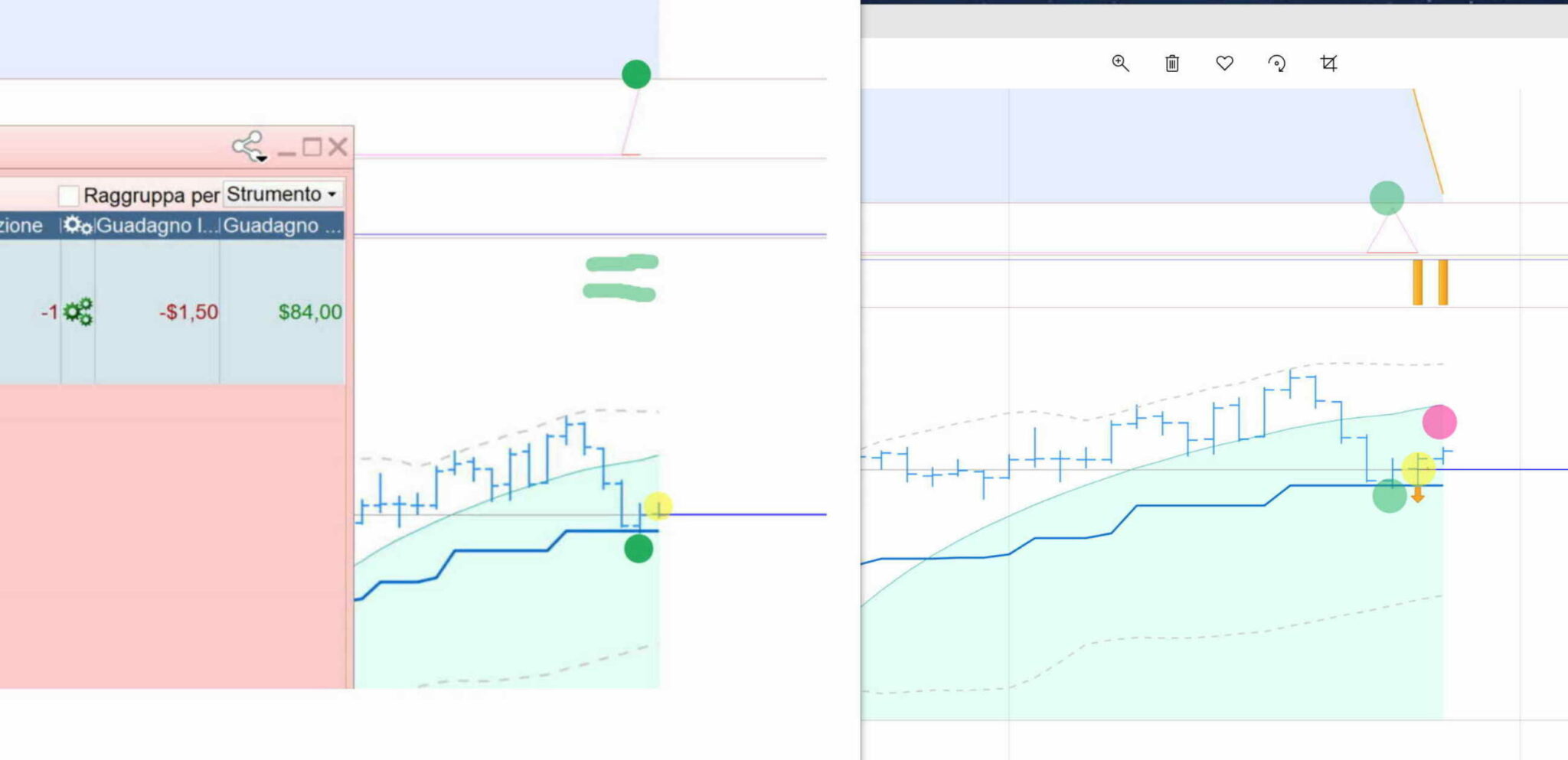 Da una posizione flat il TS genera un segnale di vendita (non è un ordine pendente) nella candela con pallino verde. Il GRAPH viola in alto conferma il segnale nella candela con pallino verde (immagine di sx)