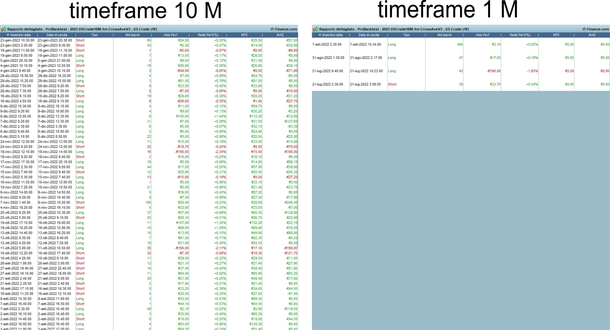 Come mai? Il codice non dovrebbe dare esattamente gli stessi segnali di entrata e poi eventualmente gestire diversamente le uscite in base al trailing stop su 10M o 1M?