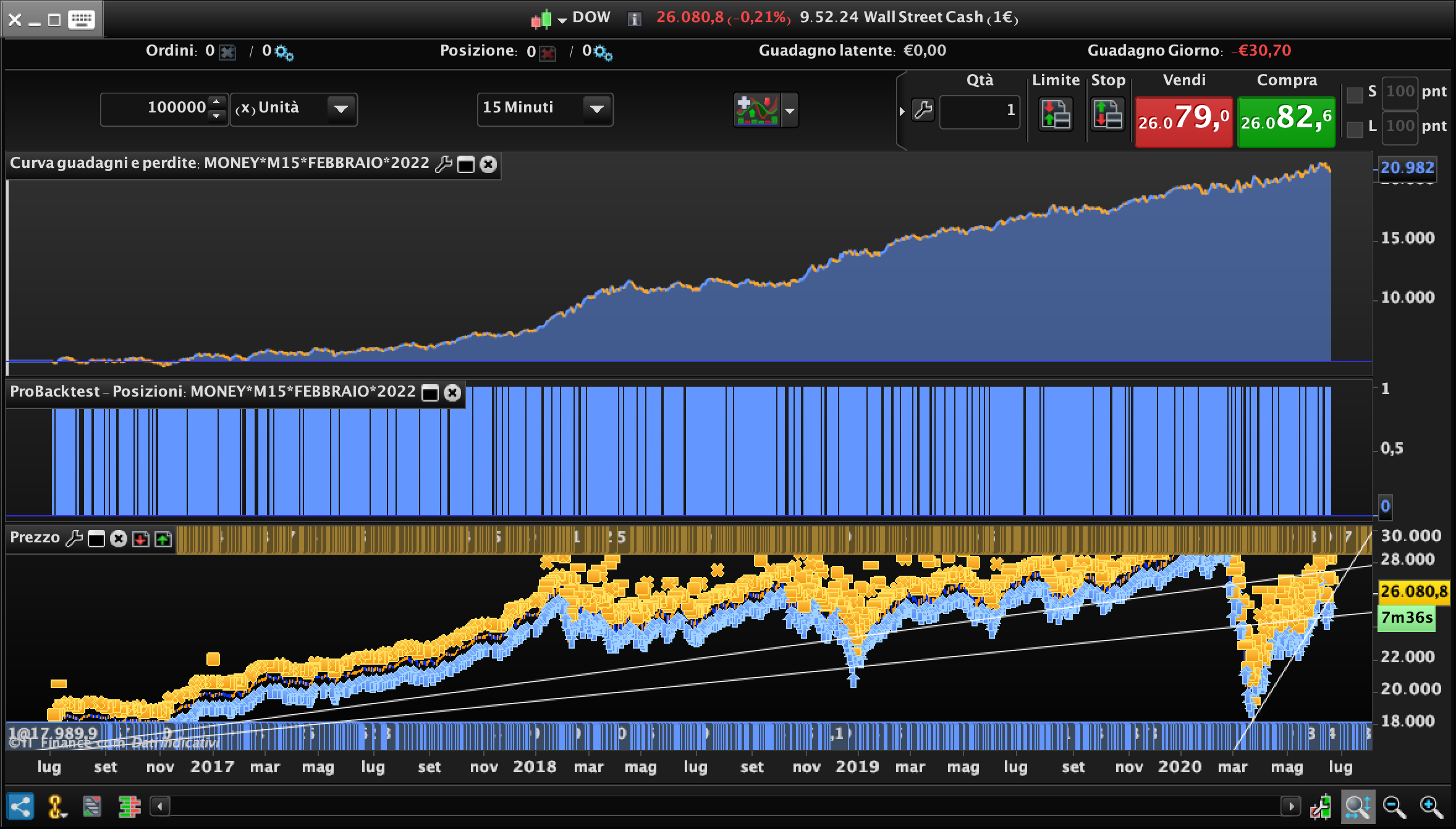 Hai giustamente usato un trailing stop in percentuale, forse sarebbe meglio usare anche uno stop in percentuale per meglio adattarsi al valore del DOW J.