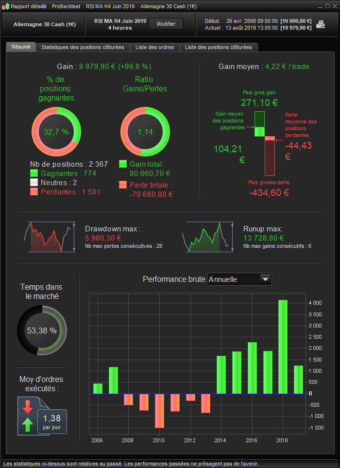 Pour les tests avant 2015 j’ai tout simplement pas eu la possibilité de backtester plus car j’ai que ProRealTime Demo. Ca montre en tous cas l’importance d’avoir une plus longue période de test, afin de pouvoir construire une stratégie “solide” 🙂