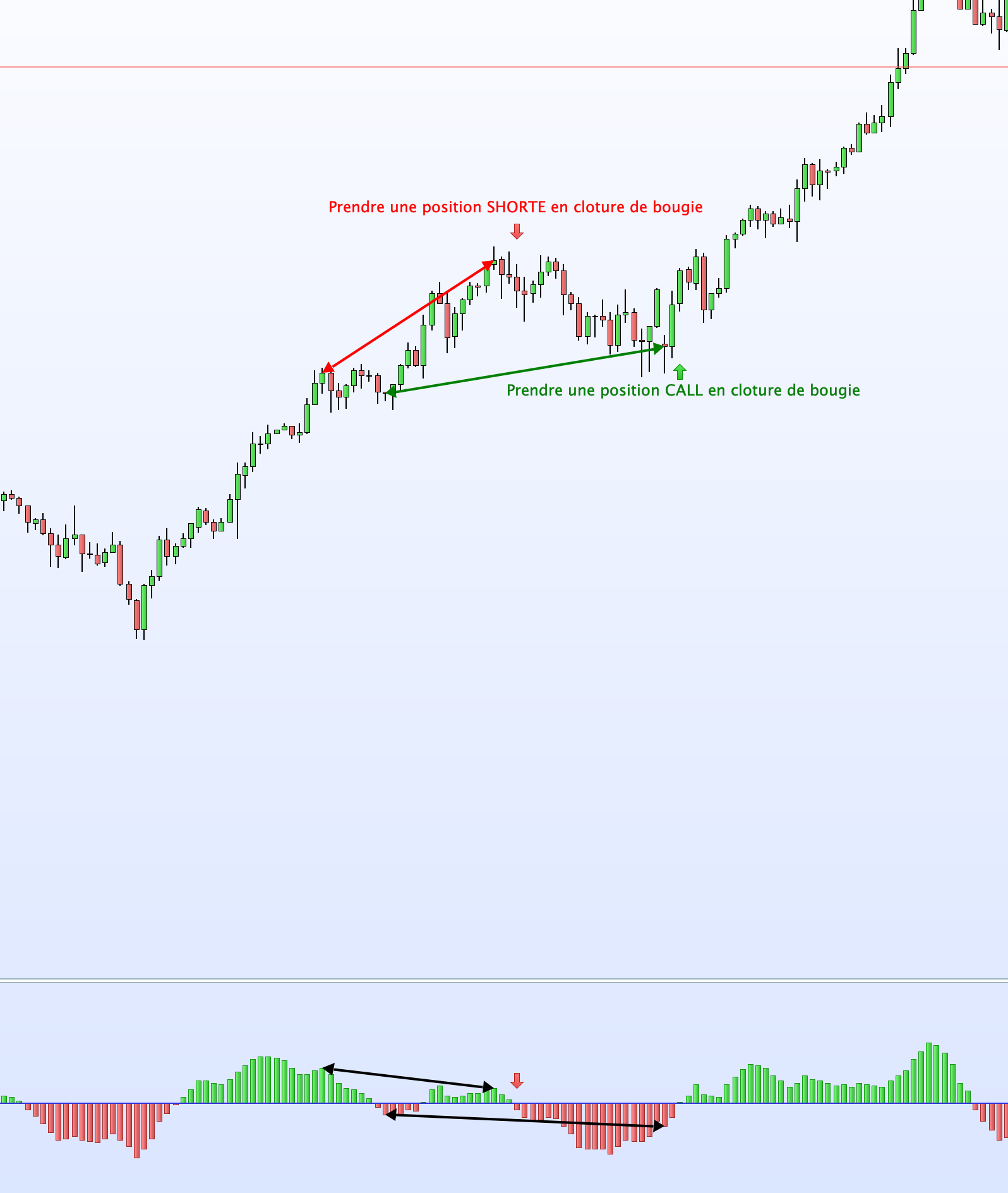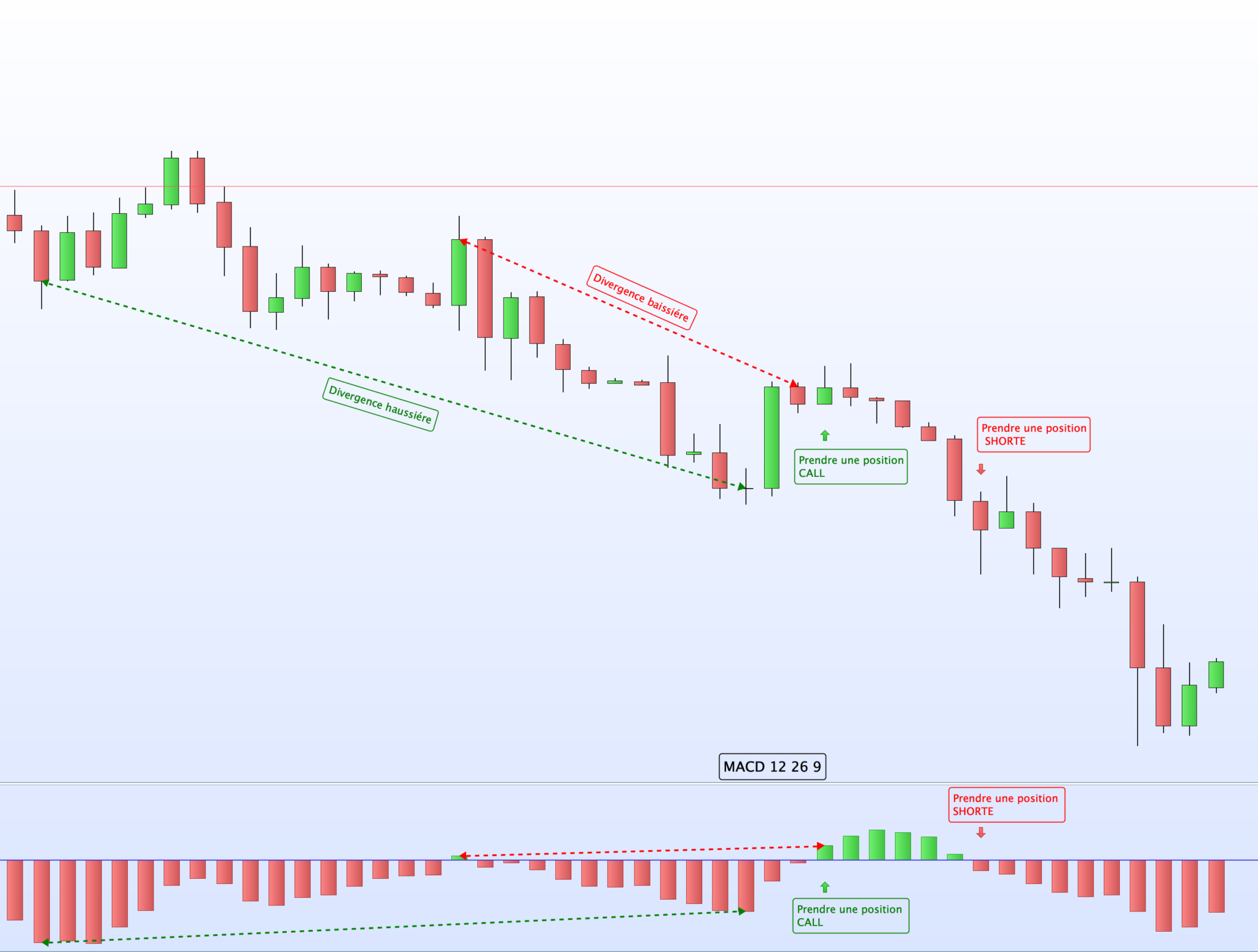-Divergence haussière et baissière sur prix et histogramme MACD 12 26 9
