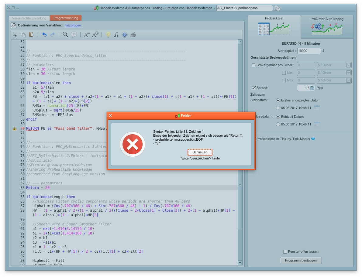 Dein code e thält die “return” anweisung. Die verwendet man jedoch ausschliesslich in Indikatoren. Setz mal “//” vor die Zeile mit Return und guck was passiert.