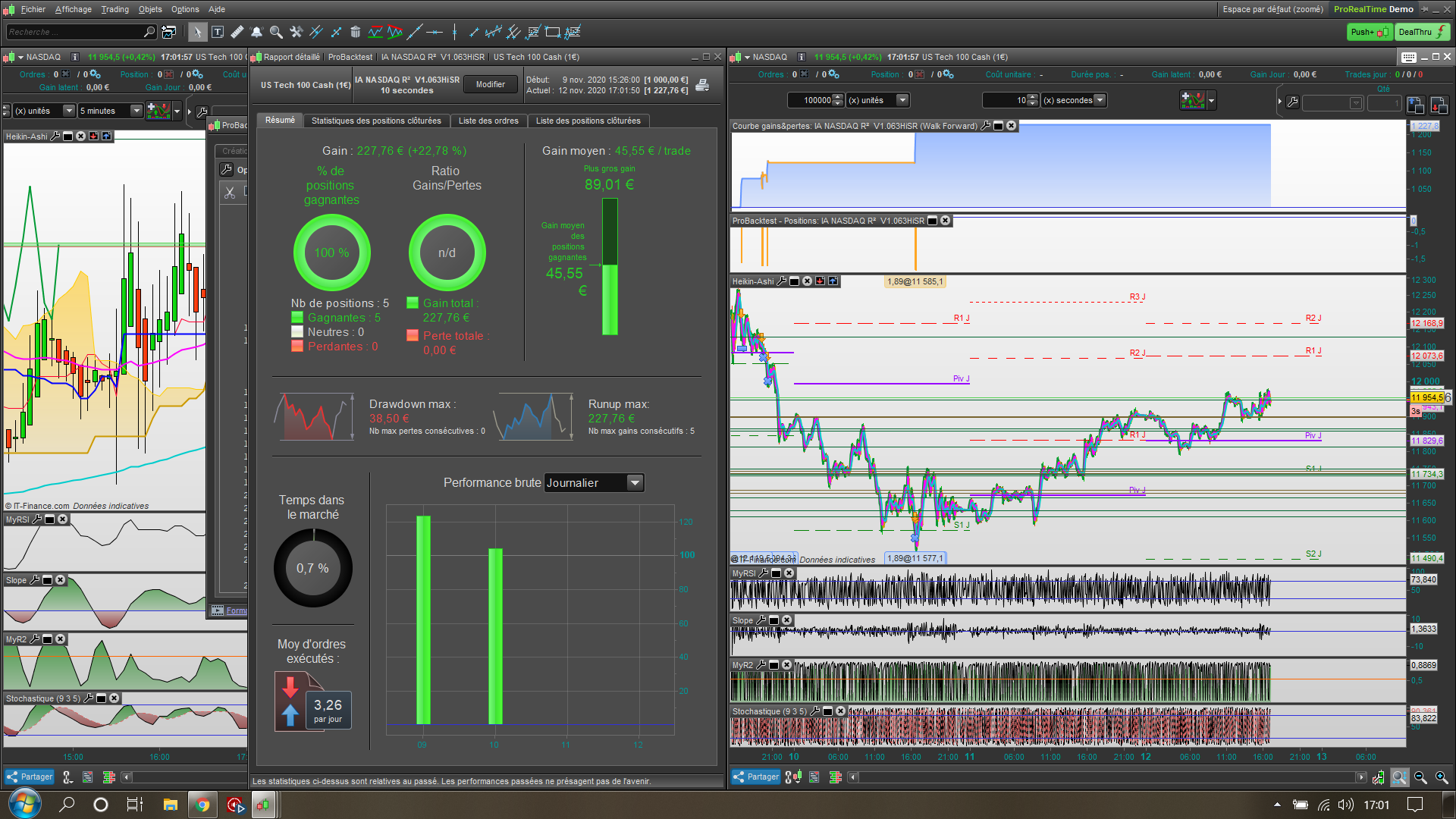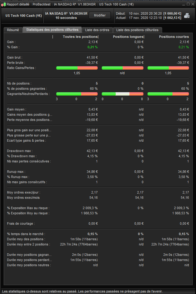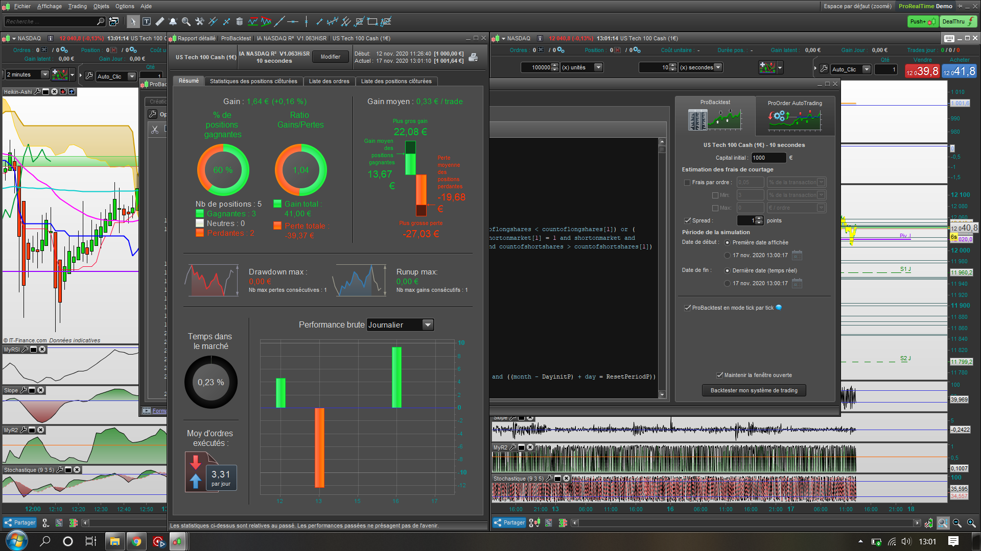 En effet c’est beaucoup plus clair, merci pour ce résumé 🙂 AMHA, il y a trop de conditions liées à des calculs d’indicateurs dans ton timeframe 10-sec. Si tu connais ta tendance dans les timeframes supérieurs, tu devrais attendre un retour à la moyenne dans ceux-ci, et trouver une action simple du prix dans la plus petite des unités de temps pour lancer ta position.Slt Nicolas, j’ai tenté de réduire les conditions en UT 10′ sans réel amélioration. j’ai ajusté et filtré mon code actuel ce qui améliore la stratégie, mais je suis convaincu qu’il y a moyen d’obtenir mieux… le code actuel fonctionne bien sur le nasdaq….sur les autres indices c’estplus compliqué.