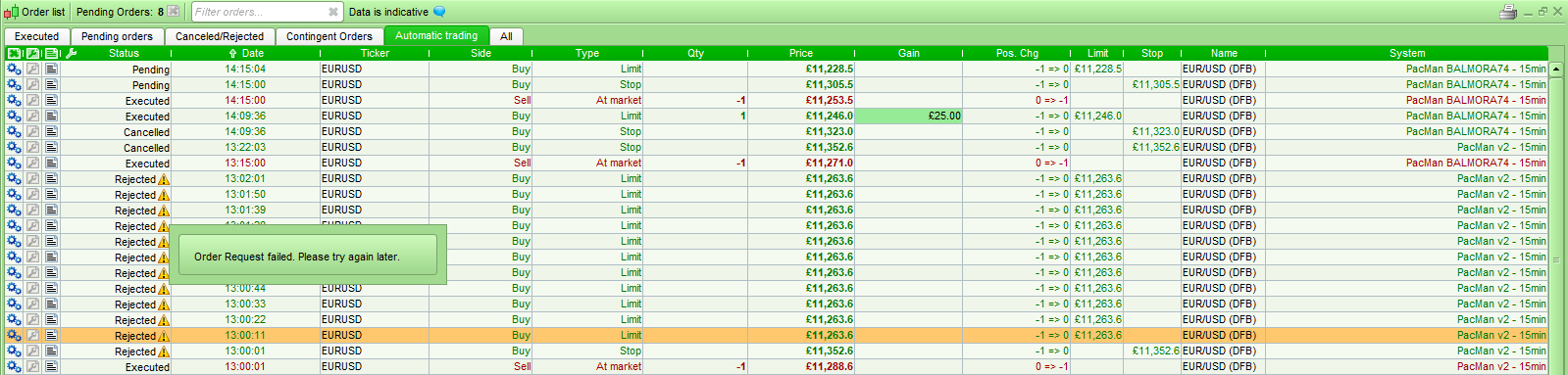I’ve had a couple of strategies on live demo test be stopped over the last couple of days. I would like to know why so that I can maybe code around the problem if possible but there is a lack of information as to why they were rejected. ‘Due to the type of rejection’ is not very helpful – nor is ‘Order request failed – please try later’. Orphaned trades are a reason never to go live with a strategy due to lack of confidence in it and so knowing why orders were rejected and so the trades orphaned is key information that we need.