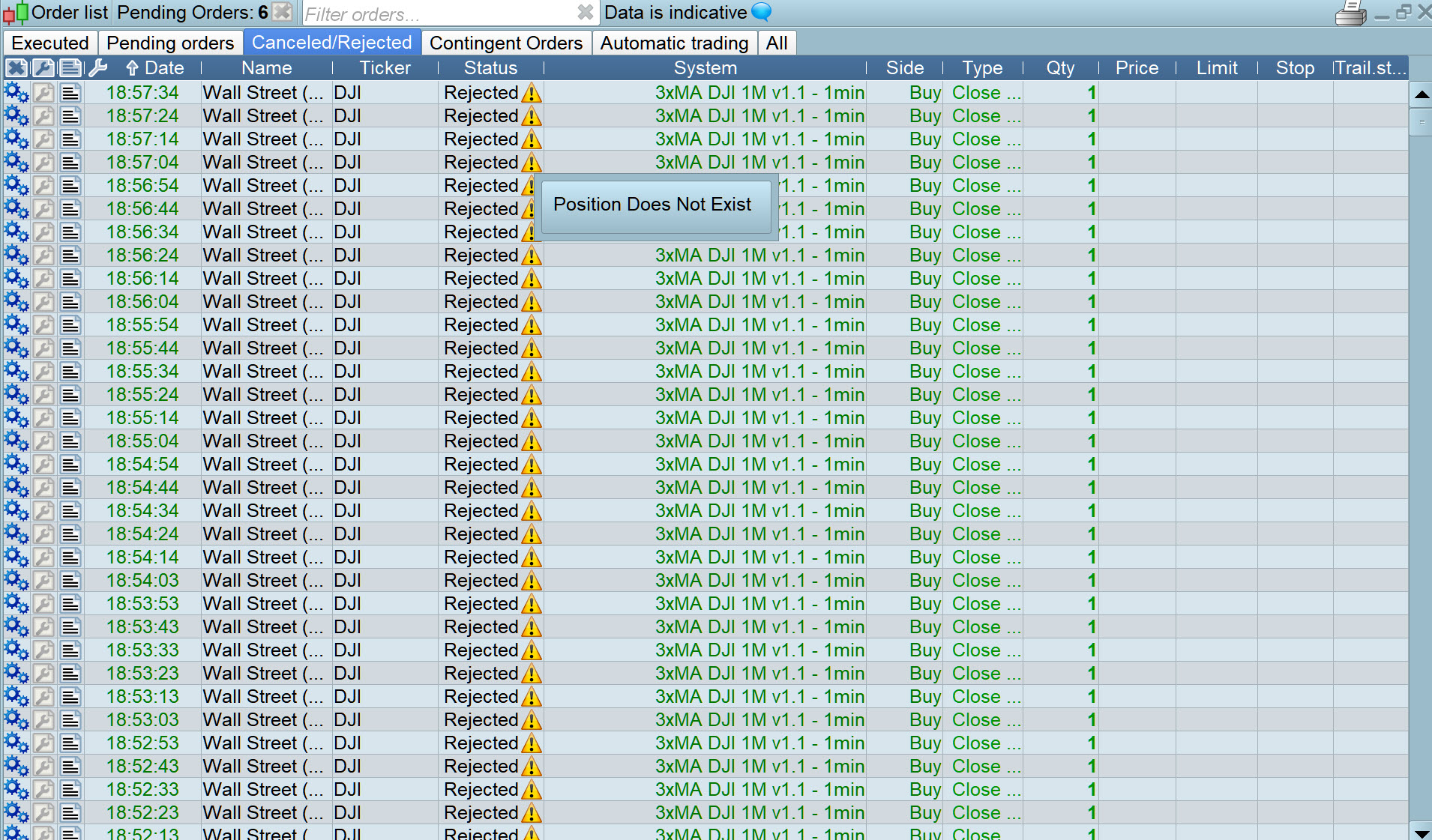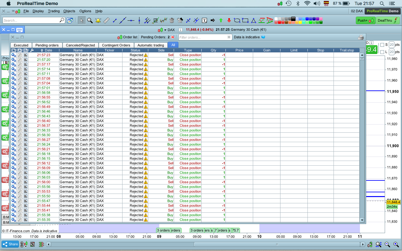 Four more strategies stopped this weekend on one of my demo accounts. I guess IG decided to stop communicating with PRT for a while again. No orphaned trades so I guess they all had 11 rejected buy orders.