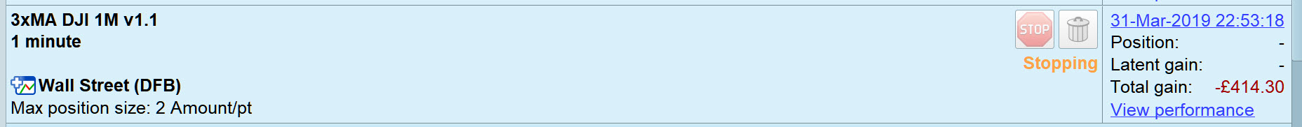 Strategy stopping, but still trading as I can see the Total Gain changing.