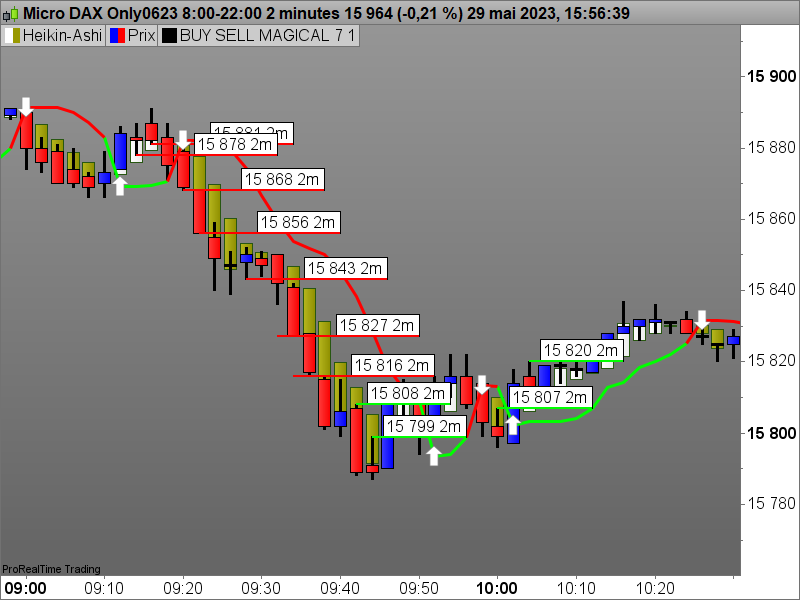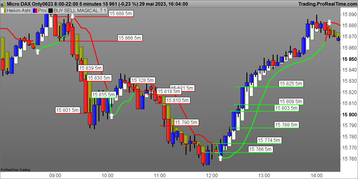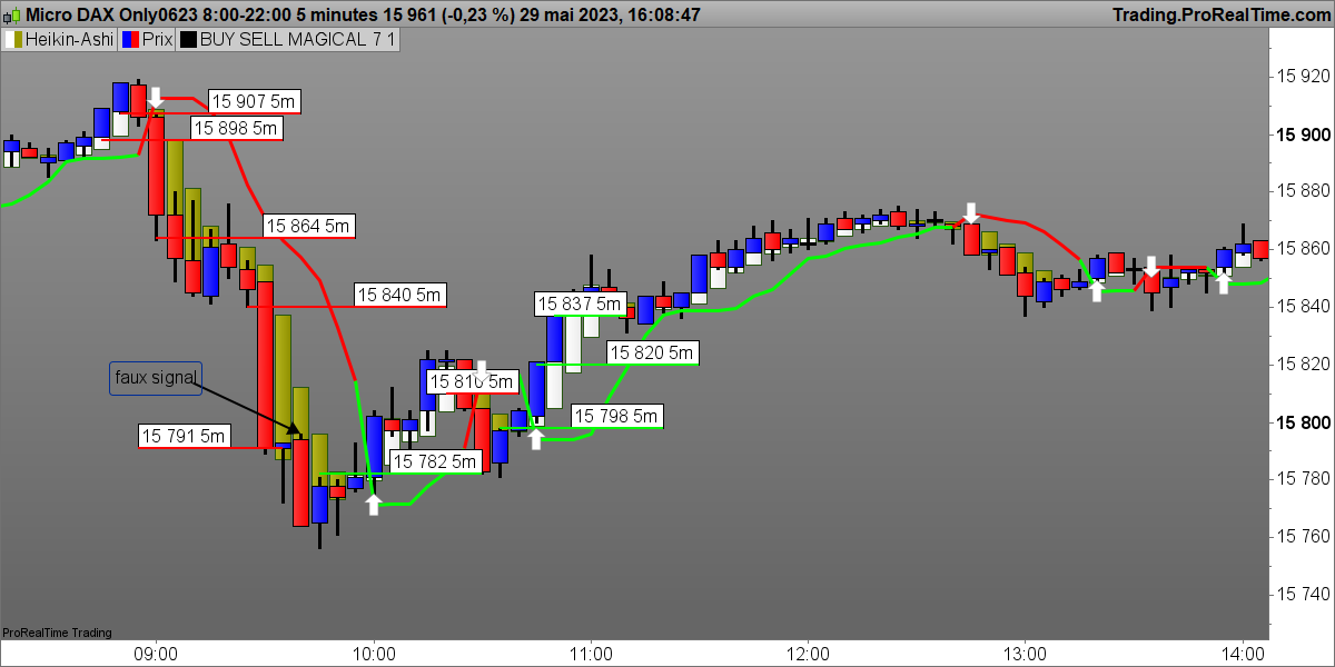 Une autre stratégie ( BINGO) tres efficace consiste à placer des hakenashi sur les bougies ( ici blanc +++ et jaune —) .si une bougie bleue ( verte comme vous voulez) avec le corps de l’hakenashi blanc visible alors on pourra jouer le reverse sur le breakout de la bougie bleue. sur le graphe ci joint, des exemples de signaux en 2 mn sur le dax ce matin. J’ai rajouté le BUY SELL MAGICAL en paramétre 7.1. donc tres court terme. les trades sont sécurisés si on a un signal BINGO avec le BUY SELL MAGICAL rouge. et inversement. Sur une bougie rouge , si il y a du “jaune” au dessus alors on pourra shorter sous le plus bas de cette bougie pour continuer le trend. ou bien on sera sur un bas de marché et dans ce cas, on prend un buystop sur le plus haut de la bougie. J’aimerai un ITF pour placer des traits de 2 bougies de largeur sur les signaux buy ou sell. merci pour votre aide. les signaux de ce matin ne sont pas représentatifs vu le peu de volumes. je vous joins plusieurs graphes de la semaine passée.