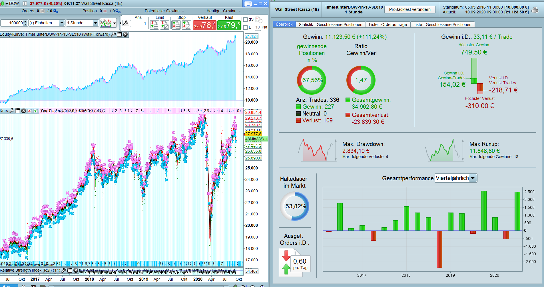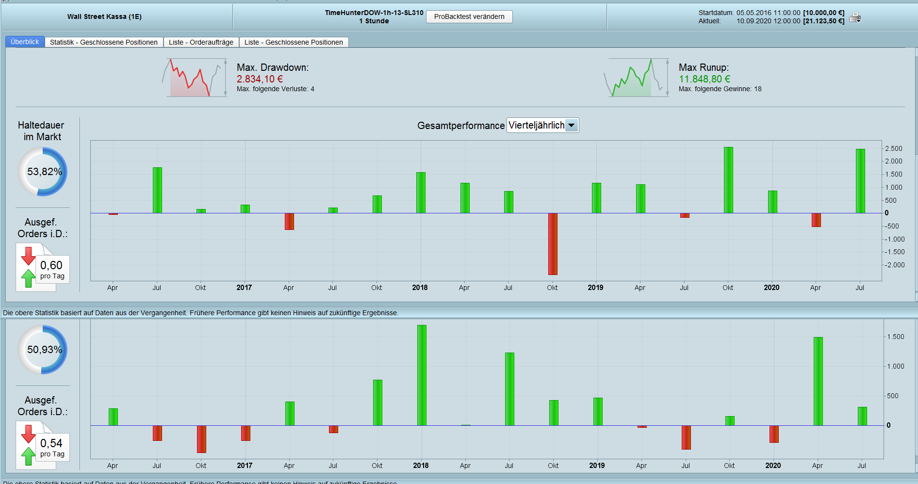 I found two profitable entry times. One at 5.a.m and the 2nd one at 1.p.m. In combination the results are more profitable than as single strategy. In direct comparison, the good months compensate the bad months, when both strategys are running at the same time. ( 5 p.m. strategy with 260 SL)