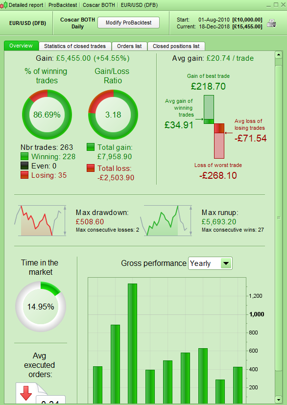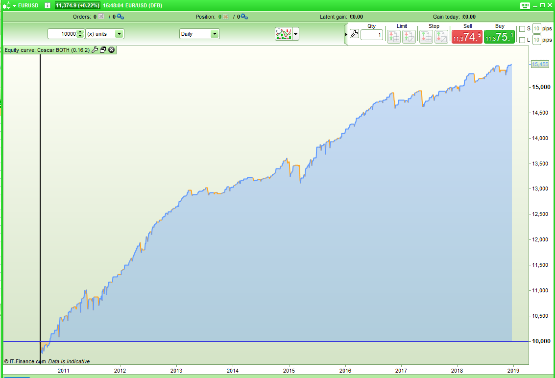 12/18/2018 at 4:56 PM #87382I prefer to take stuff away rather than add it. I have removed the fixed level stop loss (it doesn’t add much anyway) and you have levels set to reverse the trades anyway. Most trades don’t seem to be more than one day so I have added exits at the close of any day that you are in profit. The ATRS variable has been optimised to 0.16. It seems pretty stable for a EUR/USD strategy. I wouldn’t add EMA’s as you are just adding an extra level of curve fit and EMA’s are oh so easy to curve fit!
