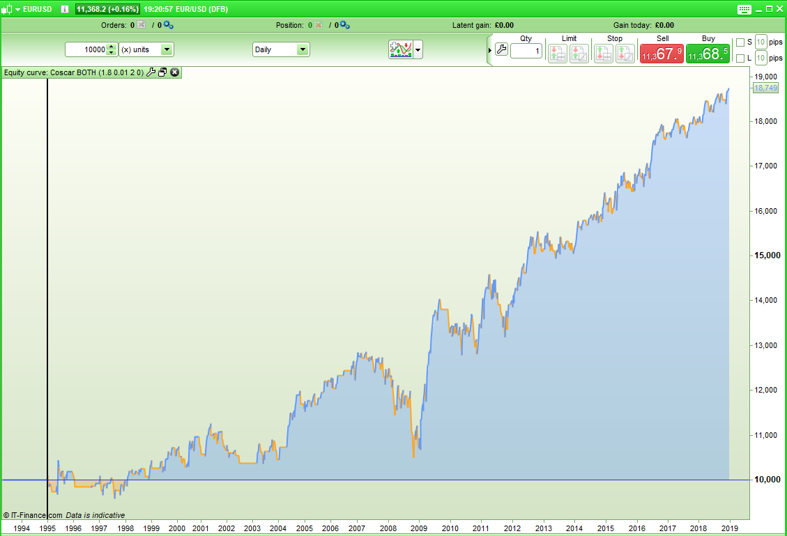 12/18/2018 at 8:30 PM #87401Just out of interest I decided to take my version of your strategy and convert it to an end of day strategy. So I removed the limit orders and just bought or sold if it was above or below lbop and hbop. I reinstated the stop loss and optimised it and ATRS. I tested back to the beginning of 1995. Even if the ride was a little rough especially through the 2008 recession it was still ultimately a good equity curve. You may be on to something with your ATR band calculations. Are you sure that you’re new to this game?