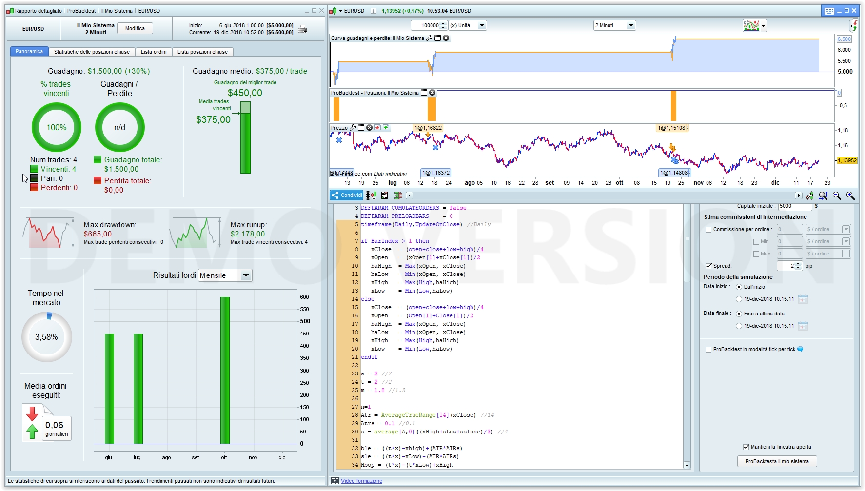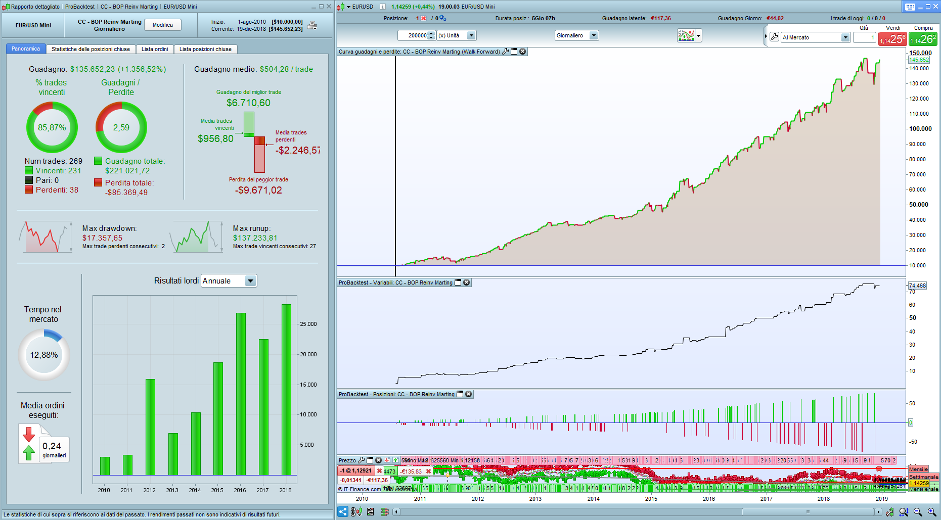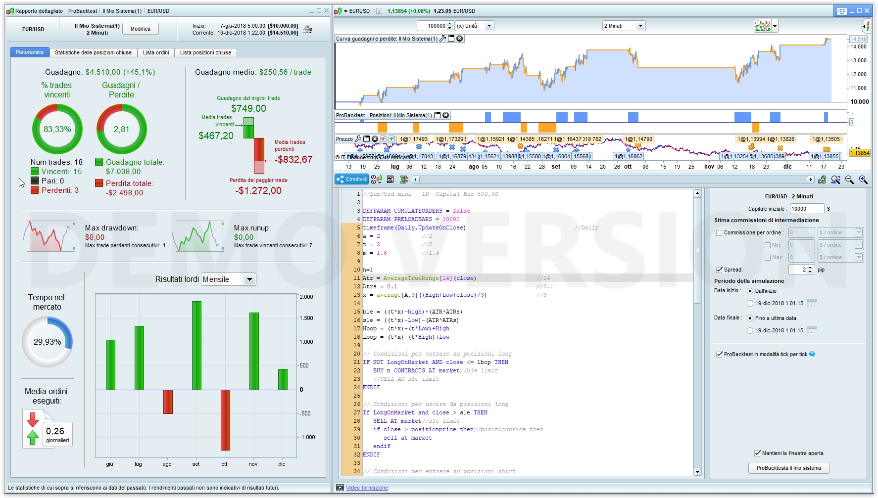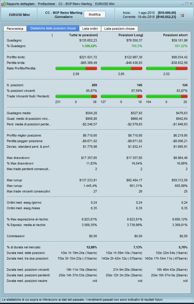 I tested it on regular EurUsd, rather than the mini one because I found out it is not just a simple math issue (it’s, or it should be, just a division by ten), because on the mini contract I’ve been reported more than 300 trades, almost all losing money. While there’s no difference when applied to DAX €25 and DAX €5, it’s the same behaviour, only multiplied/divided by 5!