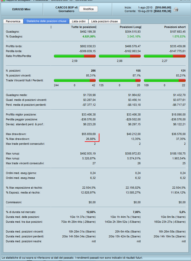 Hi Roberto, I reactivated PRT in Reale, this is the test on 200,000 bars, spread 1 pip. The overall DD is 27% and it is normal that in the end there is a value of 55,000 as proportionate to the contracts. Try disabling Reinvestment and Martingale. If there are errors, could you kindly highlight them? Thank you Greetings