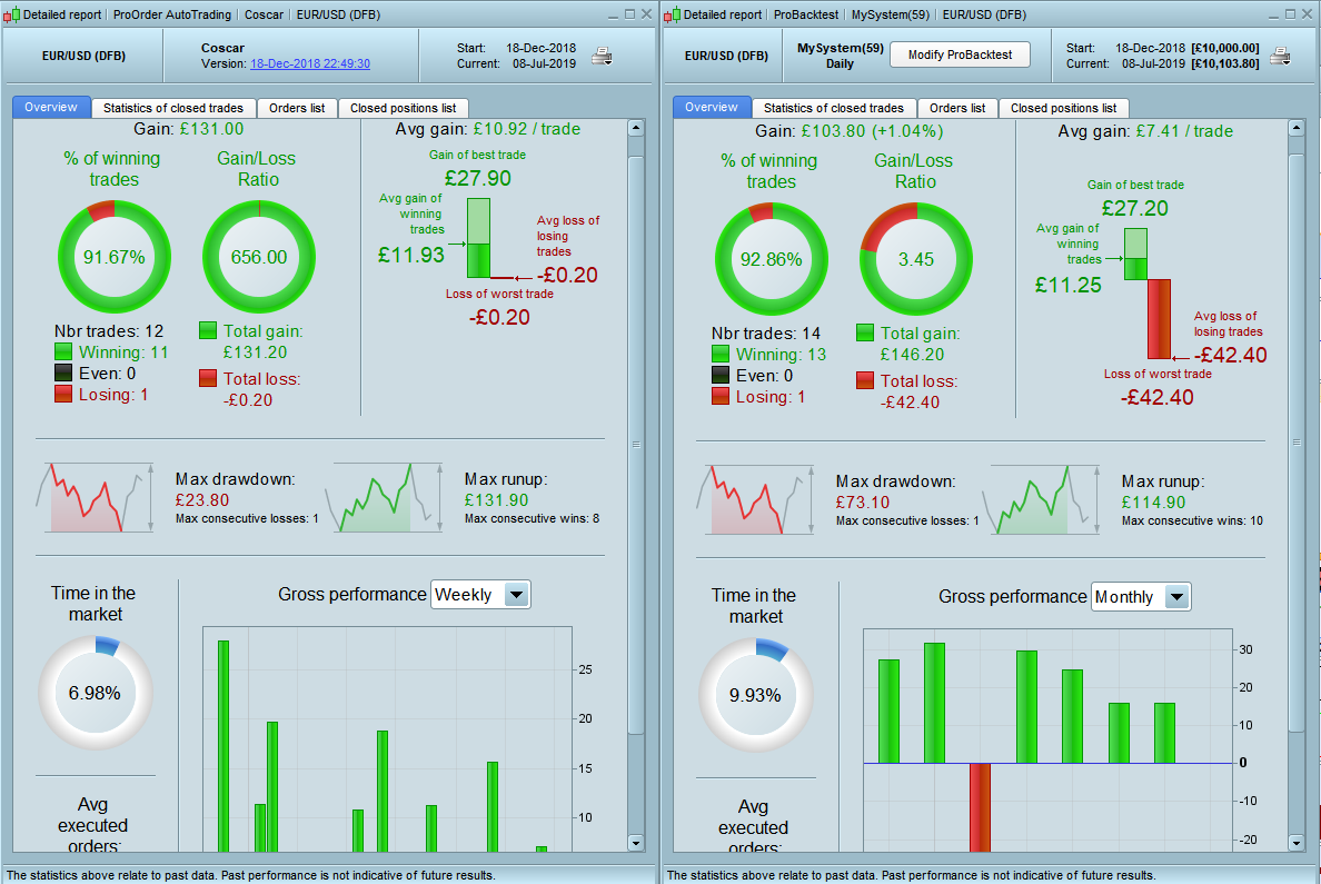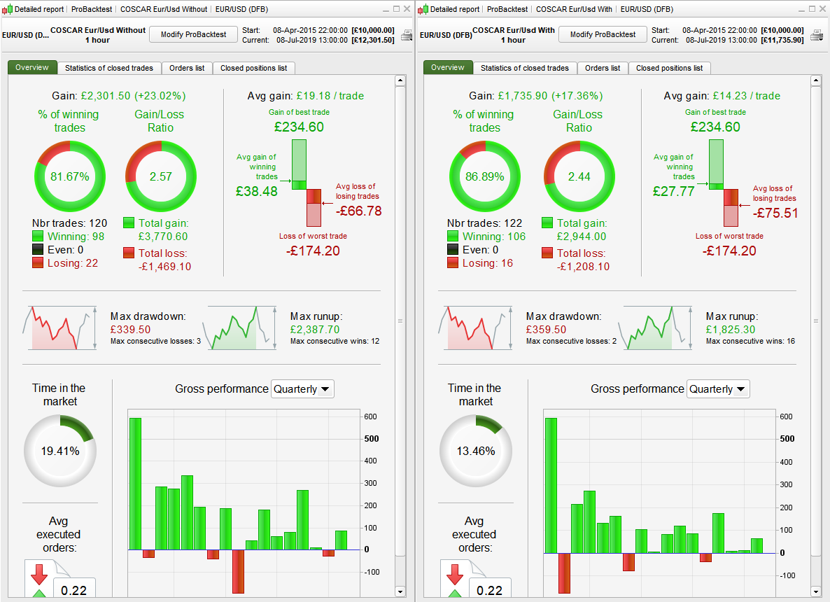 I’m still not sure that they add anything to the strategy of much worth. In my 100k bar test the LOSSEXIT condition was only ever met once. The WINEXIT condition was met 49 times but this just resulted in less overall gain. Time in market was less but with a long and short forex strategy overnight fees are not a major concern as you get paid to be short and you pay to be long.