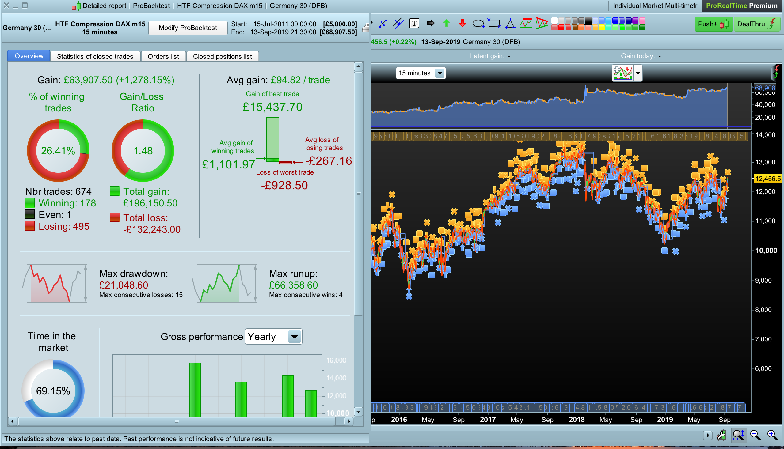 My system is not just as simple as the breakout of a Donchian (though as Im sure you know those kinds of systems have made money in the markets for years). Rather, it looks for regions of extreme price compression and then trades the breakout of those. The initial system used a Donchain channel and looked for zones of compression based on lookback windows. I have since discovered a way to replicate this system by using candle stick patterns on a higher timeframe to define the region of compression, negating the need to use Donchain channels and thus free of parameter optimisation. I shared the results of that system for Gold too. Attached here is the same system applied to DAX and Crude Oil. I find it encouraging that it delivers good results on these diverse markets, but really I will have to donate some money to the market to know for sure whether the system works.