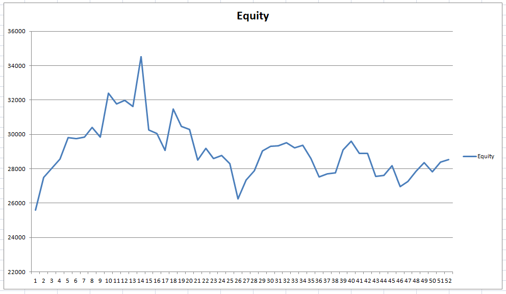 So I wrote a simple strategy that bought the Dow Jones Index on dips on a weekly chart and held a position until it either returned to profit or had been held for a certain number of weeks. No filters. All trades were done at close of bar. I tested holding for anything from 1 to 52 weeks.
