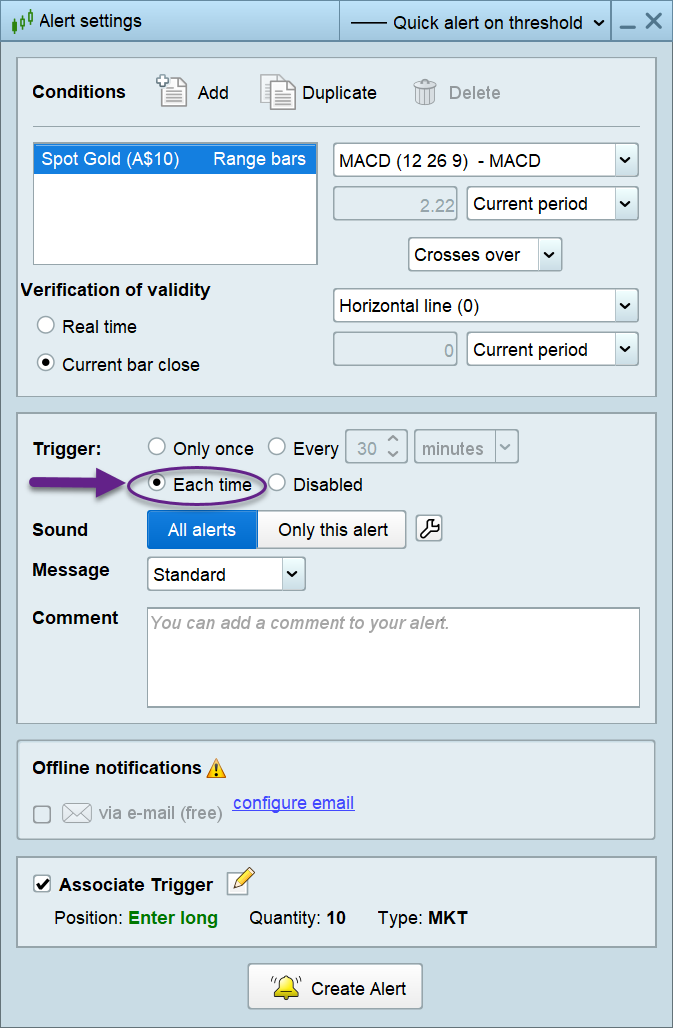 I’ve been experimenting with a strategy using the alert tool and an associated order, which has been successful so far. However, even though I have the button ticked for the alert to trigger “each time” the conditions are met, subsequent orders do not generate. My goal is to set up the conditions of the alert, and have it trigger the same order each time those conditions are met (without me going back and re-associating an order). Is there a setting somewhere that I’m missing? Thanks for your help!