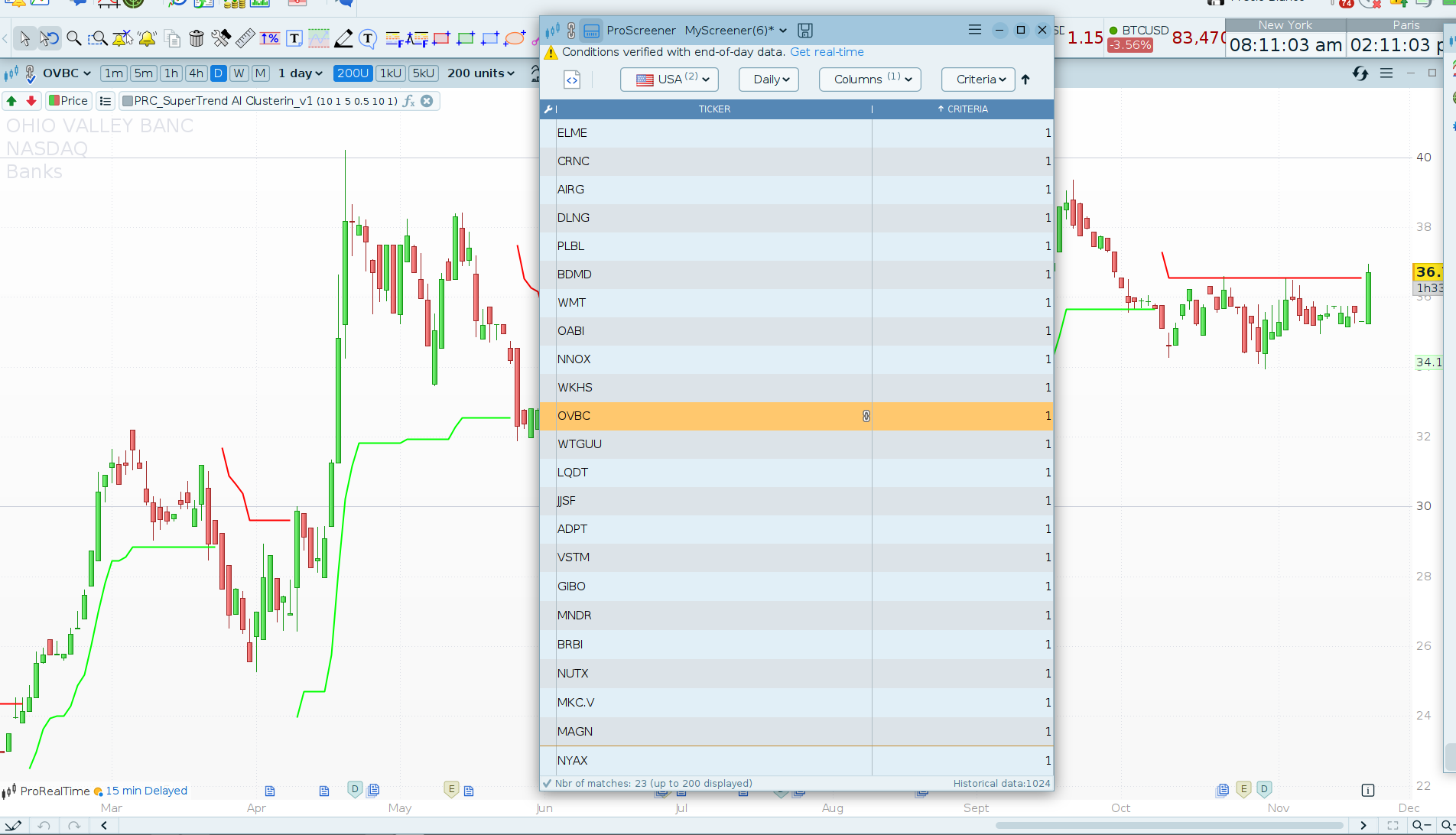 Sur le graphique voici un exemple du problème que je rencontre, la paire GBP/SEK ressort haussière sur le Screener et pourtant la tendance est baissière sur l’indicateur SuperTrendAIClusterin ! Je joins aussi le code afin de trouver ce qui cloche!!!