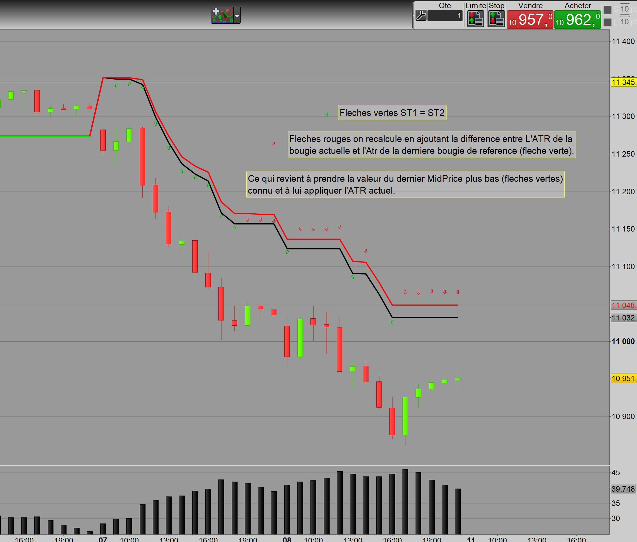 A chaque nouveau MidPrice plus bas le ST1 et le ST2 auront donc la même valeur, mais dans les zones plates le ST1 restera fixe alors que le ST2 évoluera selon la variation de l’ATR depuis le début de la zone plate.