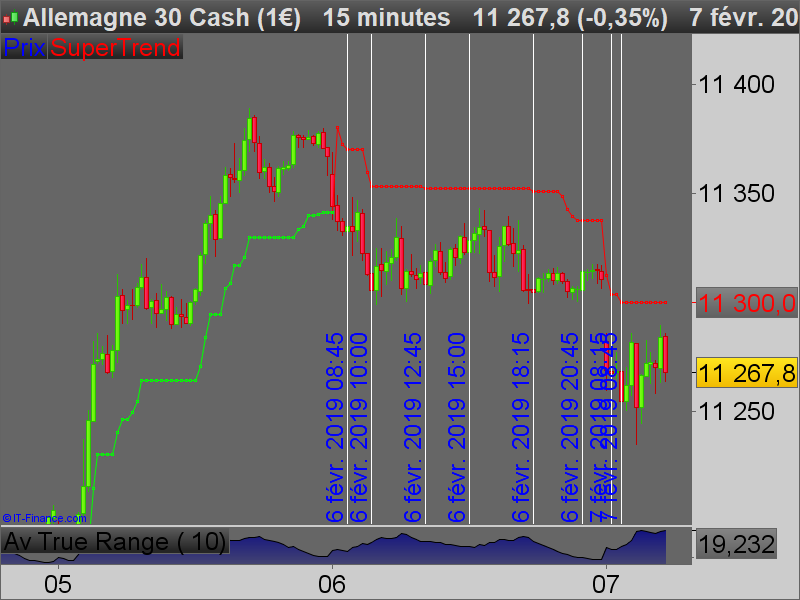 Je souhaiterais que dans ces périodes ou le prix moyen ne marque pas de valeur plus basse (dans le cas d’un ST cassé à la baisse) le ST garde la valeur du prix moyen référence (bougies notées par un trait sur mon graphe) mais que la différence entre la valeur de l’ATR au moment de la cassure (bougies notées par un trait sur mon graphe) et l’ATR actuel de la bougie en court soit ajoutée ou retranchée de la valeur du ST.