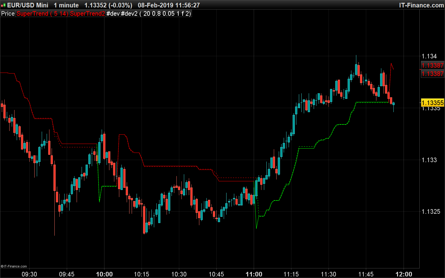 Sans facteur, on note une toute petite variation, même en timeframe 1-minute. En trait plein le Supertend modifié, en pointillé la version originale.