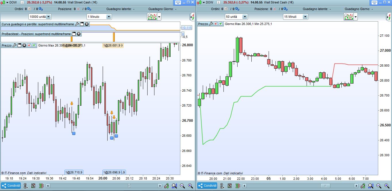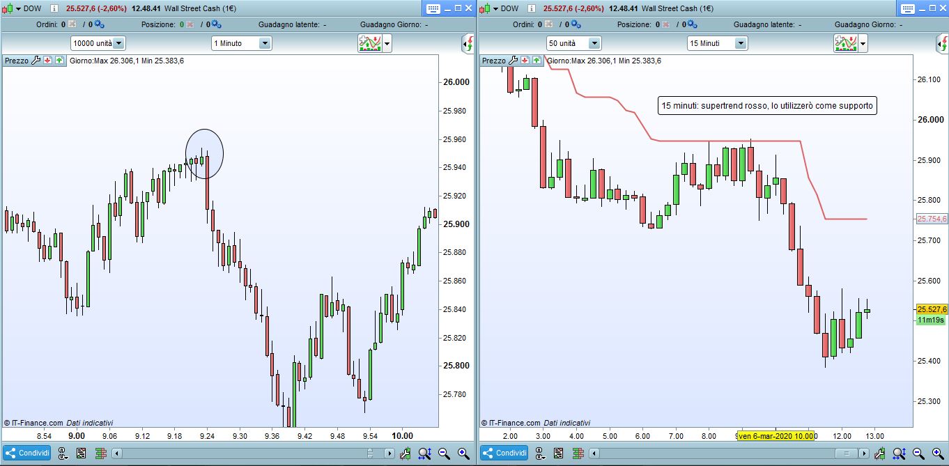 Vi allego comunque un’immagine per capire meglio: dow jones, oggi alle 9:23 ad 1 minuto il prezzo ha superato il valore del supertrend, ha fatto un false breakout ed è tornato indietro: io devo comprare sul minimo della candela in cui c’è stato il false breakout, e quindi entrerò sul minimo della candela a 1 minuto delle 9:23. Con stop sopra il massimo della candela ad 1 minuto.