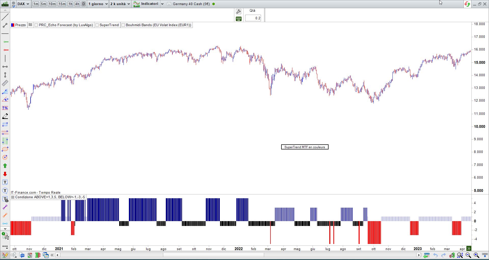 prix superieur au supertrend mensuel, hebdo, journalier en bleu fonce