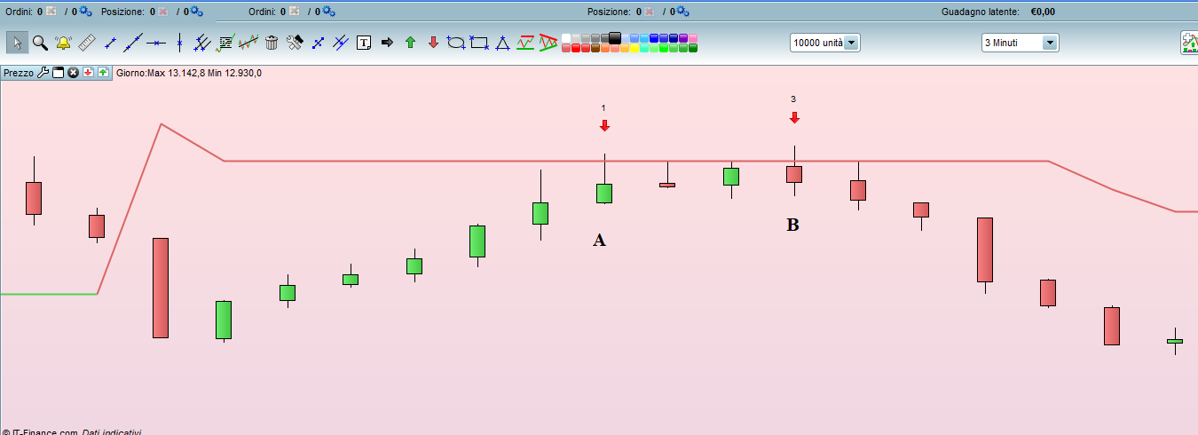 Qui c’è il Dax 3 minuti e si nota che la prima barra, indicata con A, supera il tetto del supertrend ma la chiusura è al di sotto di questo e, pertanto, il supertrend non cambia colore.