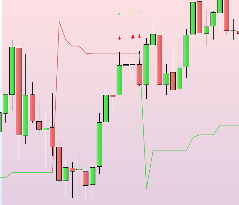 Ciò che l’indicatore dovrebbe segnalare, è quello che ho disegnato a mano. Ovvero una freccia rossa orientata a sud, segnale di vendita, ed un numero che indica di quanti punti il Dax ha superato il supertrend. Si vede, ad esempio, che nel caso della candela A il superamento è stato di 1 punto e, nel caso della candela B, di 3 punti (arrotondati all’intero, naturalmente).