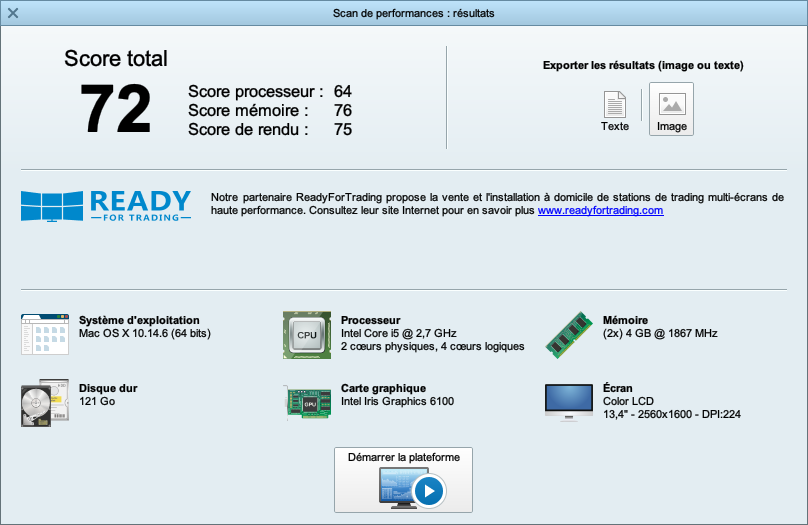 Bonjour, j’ai un mac book pro retina de 2015 (8g de ram, 2,7 Ghz I5, OS Mojave) specs ci-joint, pas une bête de course mais quelque chose de correct pour faire tourner PRT trading. Hors depuis quelques temps, la plateforme PRT V11.1 sollicite trop mon système et mon mac plante sans cesse, il chauffe puis se bloque ou s’éteint carrément parfois. Cela ne se produit que quand j’utilise la plateforme PRT, quand j’utilise mon mac avec d’autres applications, il chauffe bien entendu mais ne plante pas tout mon système. Du coup je suis dans l’incapacité de trader plusieurs heures sur PRT ouvert sans que mon mac ne se bloque. Je précise que quand j’utilise PRT je n’ouvre que mon navigateur internet avec un ou deux onglets et rien d’autre pour économiser des ressources et éviter le plantage, j’ai aussi nettoyé mon système et vérifier le hardware et j’ai également ouvert une nouvelle session où je n’utilise plus que safari (chrome est un goinfre de RAM) pour vraiment économiser de la ressource mais rien n’y fait je ne peux pas passer une journée avec ma plateforme sans que celle ci ne me force à redémarrer mon mac plusieurs fois dans la journée.