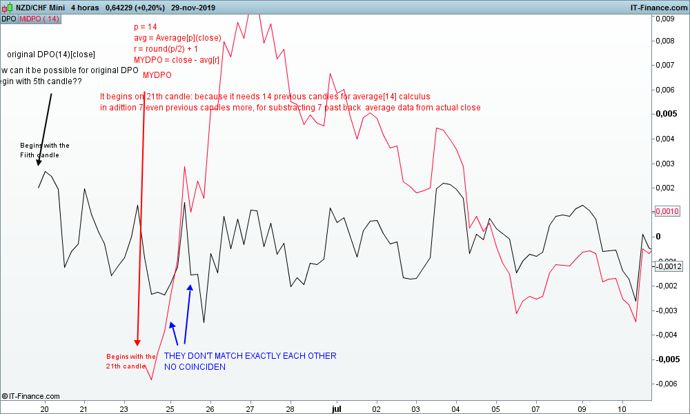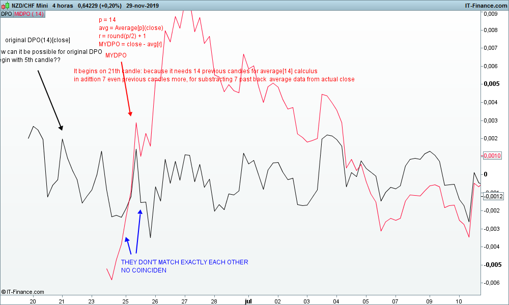 Nicolás´ homemade MYDPO seems not to be exactly match with the original DPO…. How can original DPO begin with 5th candle in the chart? Meanwhile homemade MYDPO needs to begin with 21th candle in chart? (14 previous candles for Average[14](close) purposes in adittion 7 even previous candles more, for substracting past data Average from actual close)