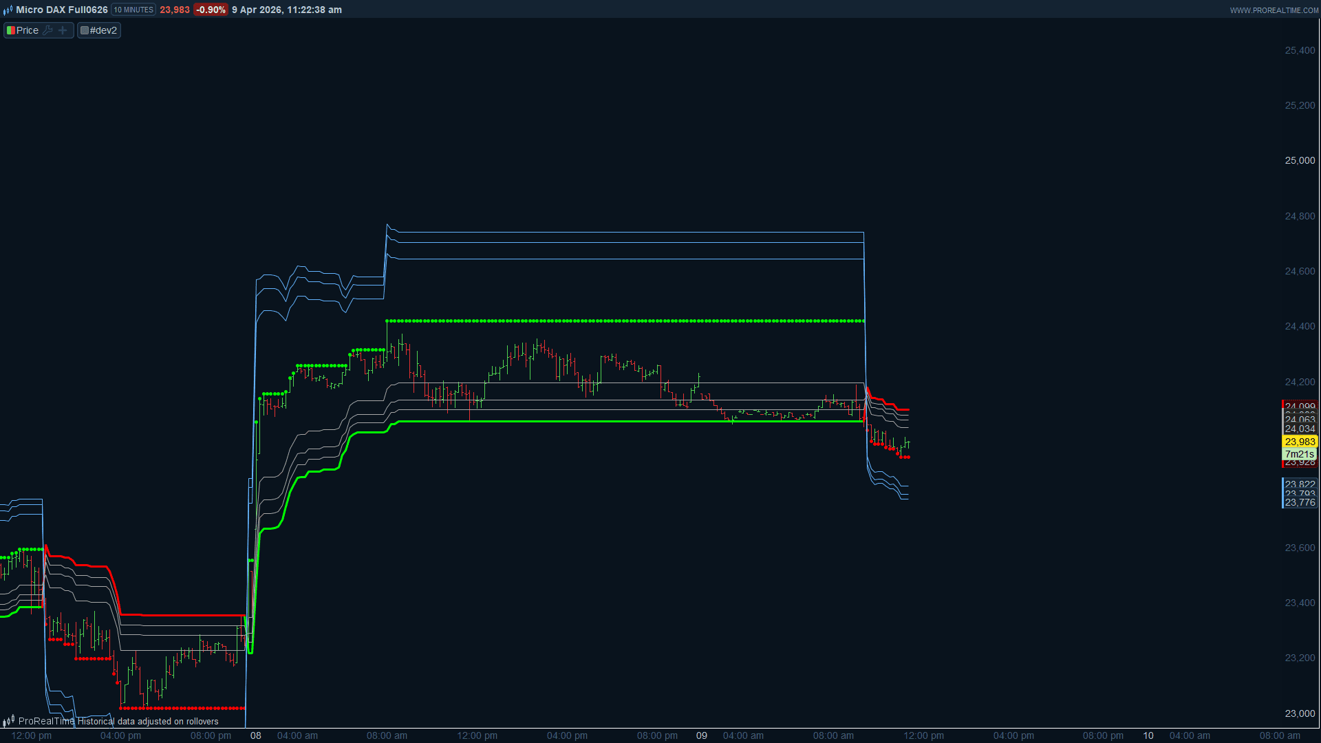 Je comprends bien l’idée. Actuellement les niveaux f1, f2, f3 sont tracés entre l’extremum (ex) et le trailing stop (trail), ce qui représente les retracements vers le stop. Tu veux ajouter les niveaux symétriques de l’autre côté de l’extremum, c’est-à-dire les extensions au-delà du prix extrême, pour matérialiser les premières zones de rebond/continuation après une forte poussée.