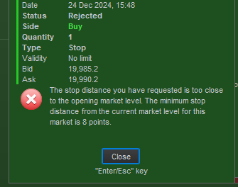 If you try and place a manual trade with too small a stop distance to the current price, you can get a similar message when the position is rejected.