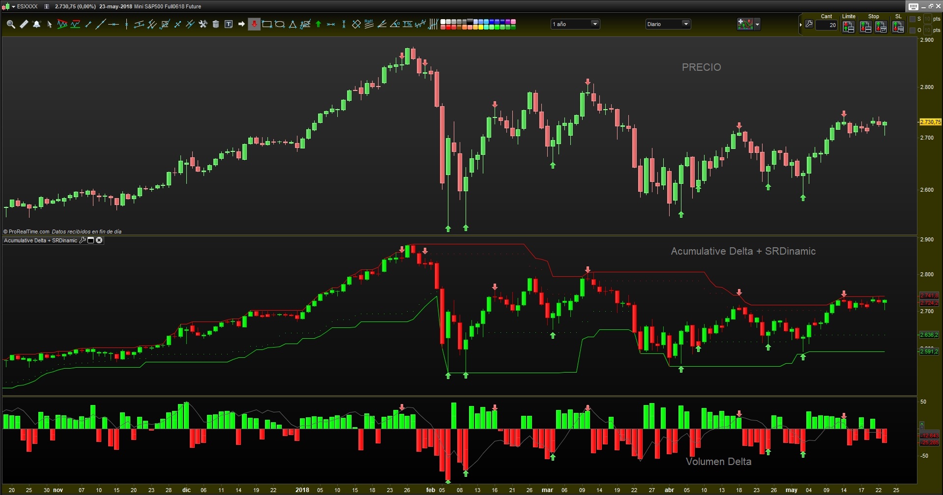 Obtenemos un indicador sobre el precio donde la vela marca el punto de reversión y el volumen delta detecta una anomalía o divergencia en el precio: