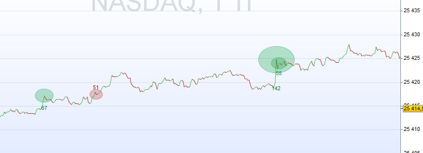 DRAWTEXT(“●”, barindex, high,SansSerif,bold,30) COLOURED(255,0,0,100)