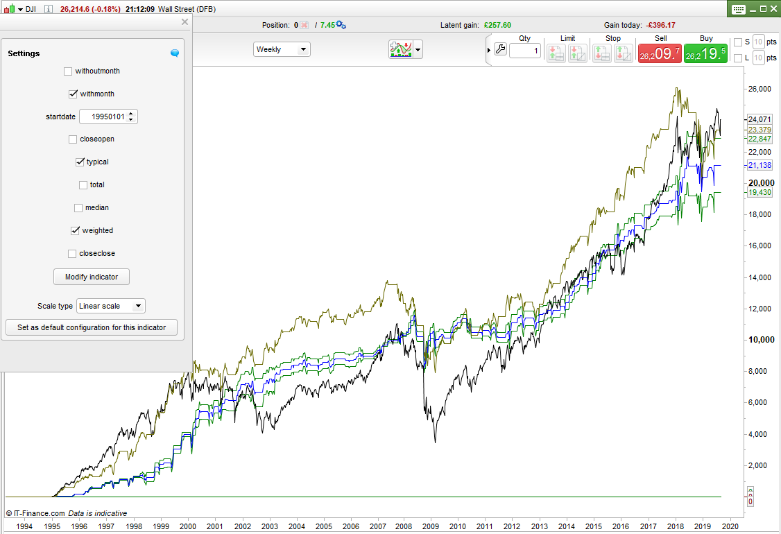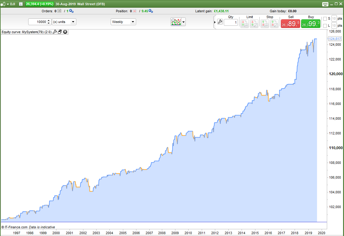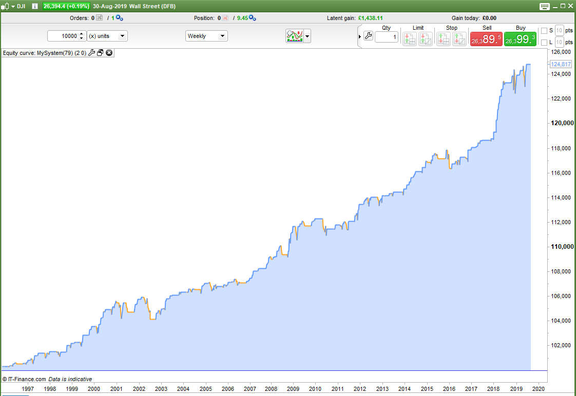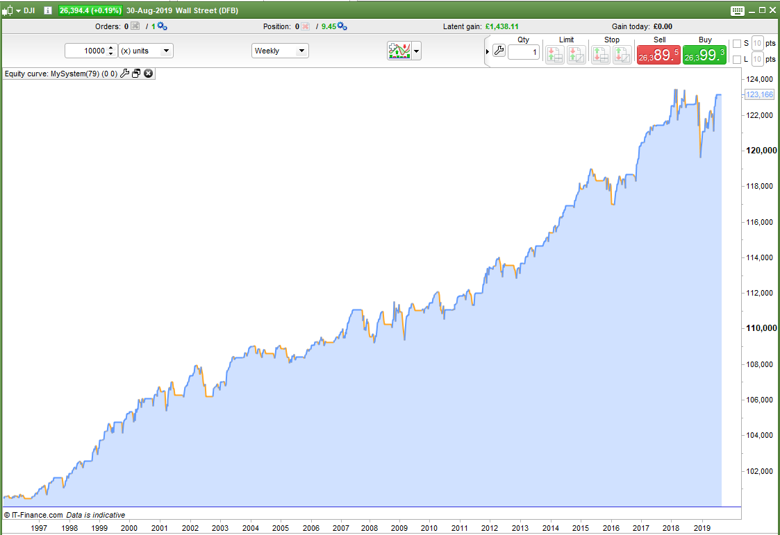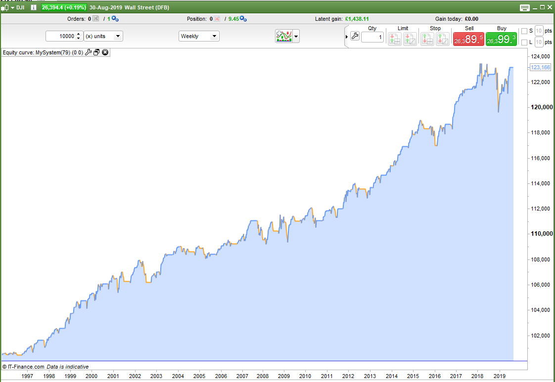 Not one to give up easily I decided to test the idea of trading only in months that have historically had more up weeks than the average for all months. This idea didn’t work but in the process I accidentally got a comparison the wrong way round by using a < instead of a > and I found that buying in bad weeks in historically bad months was actually a good idea! It is a kind of Warren Buffett method by turning seasonality on its head. It makes sense really that if a month has historically been a bad month to hold a long position then others will be getting out so if you buy the dips you get good value. Also in a market downturn the number of months performing below average will increase meaning more opportunities to buy the dips at very low prices. The second image is this new theory on the DJI. It hasn’t worked so well in the recent volatility so still some work to do. The exits are still very crude so that might be an area where big improvement could be made.