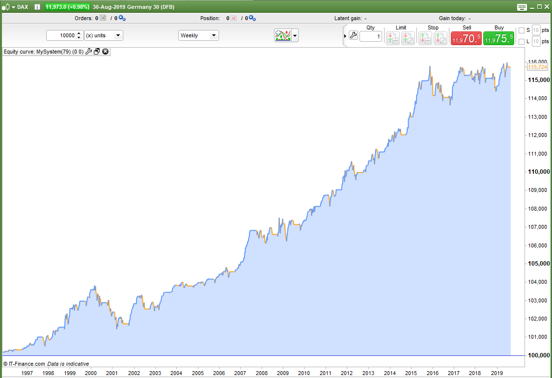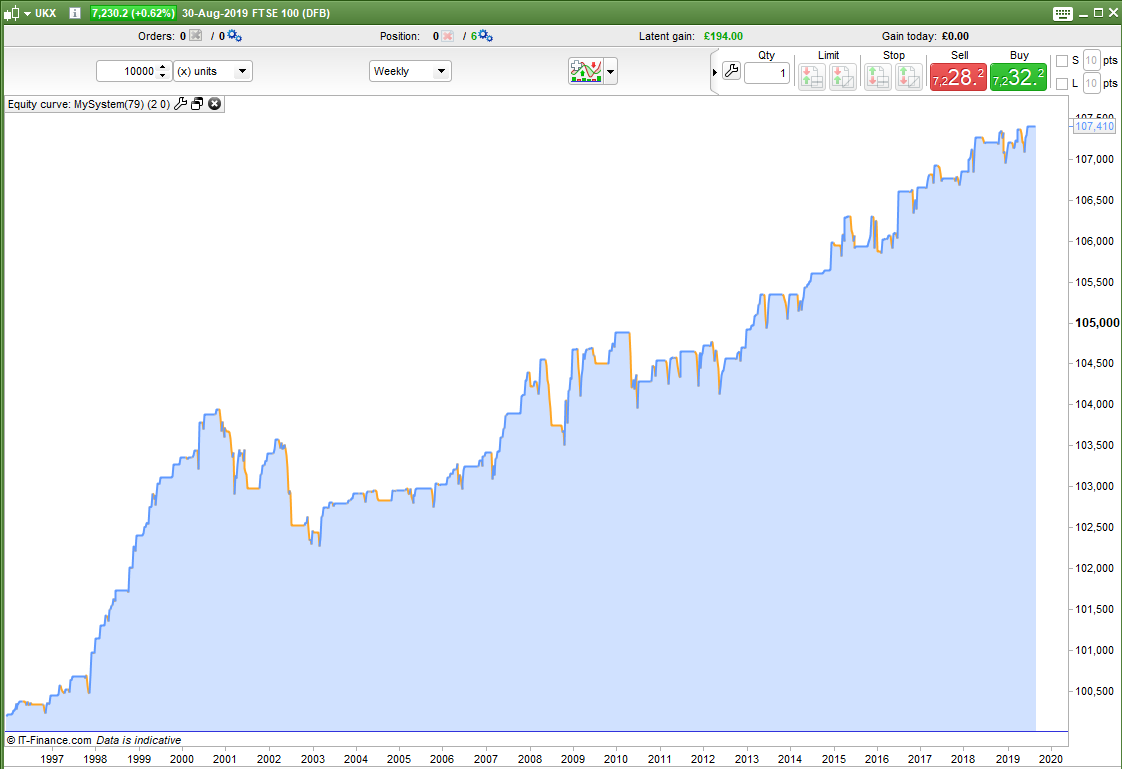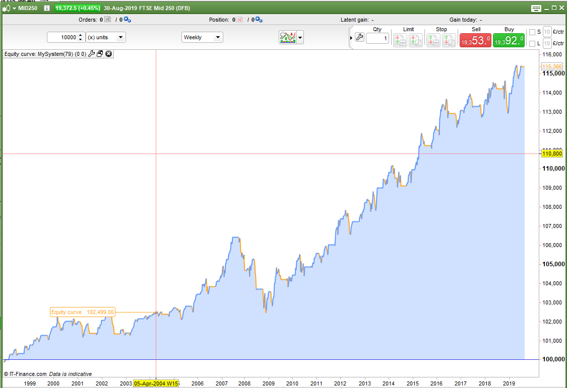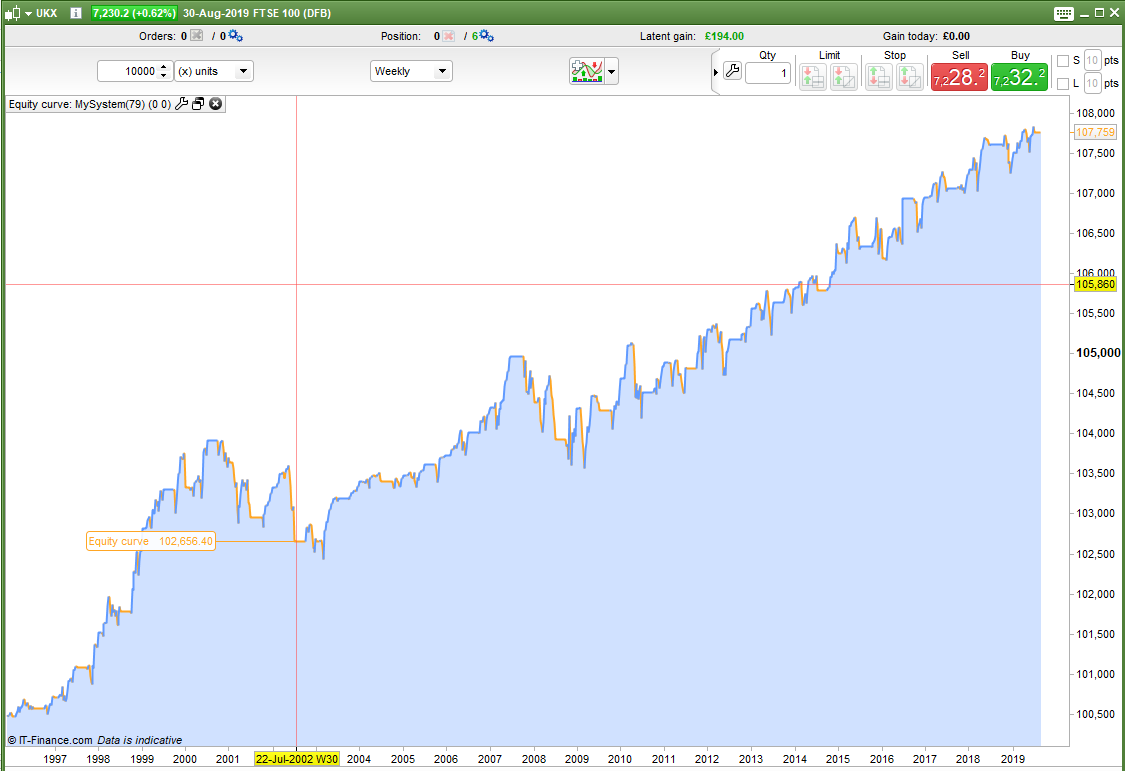 As well as trying to beat buy and hold one of our other aims should be to reduce draw down. With buy and hold you would need to sit uncomfortably through some rather long down periods watching your profits disappear before waiting for them to slowly return again. Beating buy and hold is one challenge but if I can create a robust strategy that will match it or get close to it or even just make a nice annual return but without any massive draw down then I have created a strategy that returns good value for money. A strategy is not only about the final number but about how you got there too.