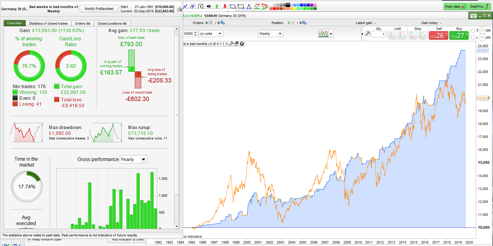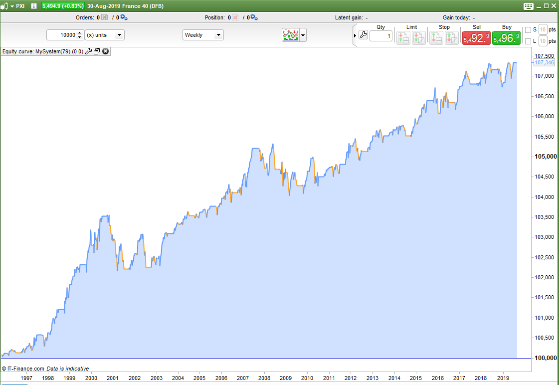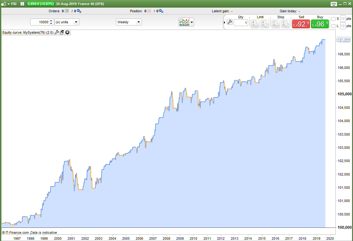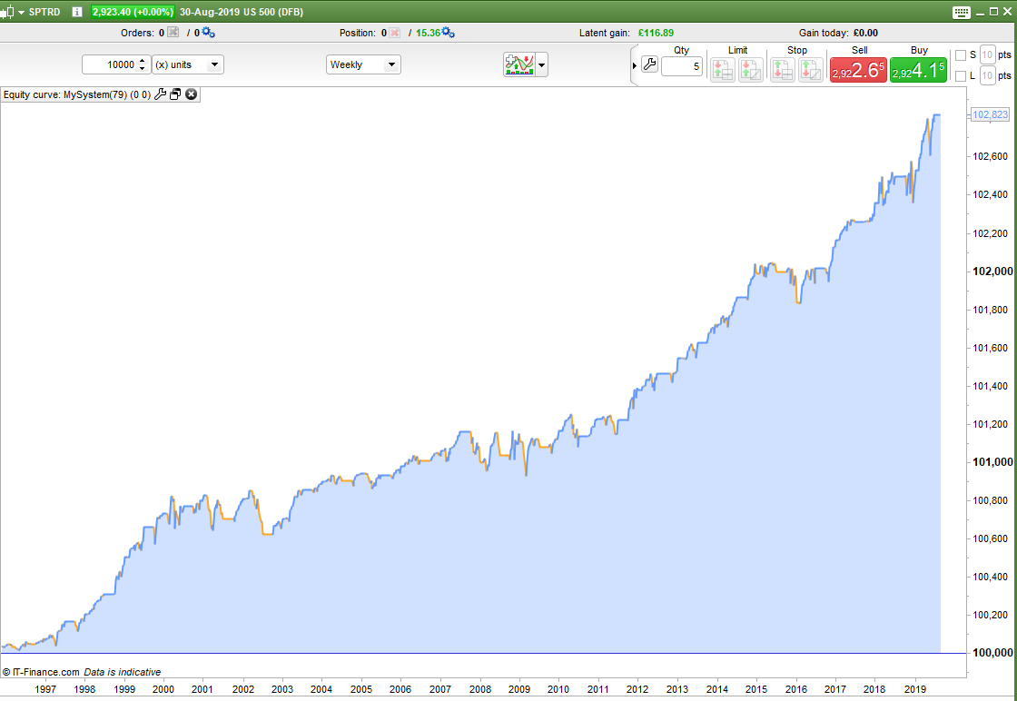 I tested with a spread of 4. Some markets are a little more than this when closed and some are a little less but it is a weekly strategy so spread is not as important anyway. I used 1.6 for the SP500. I tested from 01 Jan 1995 as this is around when algo trading started to take off and market behaviour changed.