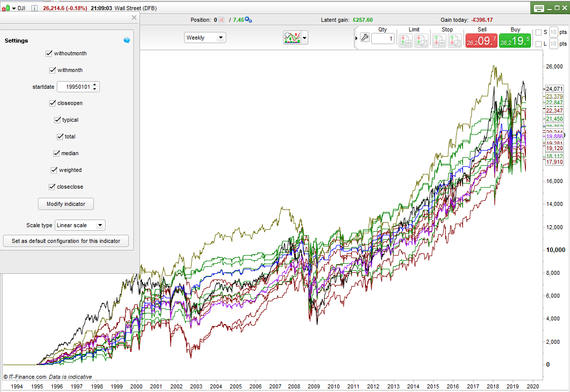 So next I coded an indicator that could draw equity curves for buying on every bar, buying on every bar that was a dip based on each of the six conditions and then also with and without the ‘holiday’ filter. I made the indicator so that I could turn on and off different lines. An average of all the shown buy on the dip lines was also calculated and shown. With this I was able to clearly see which lines performed best and which combination of lines had the best average equity curve.