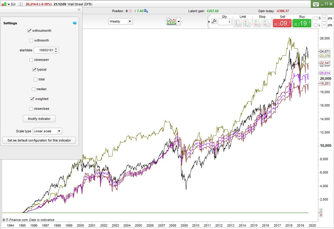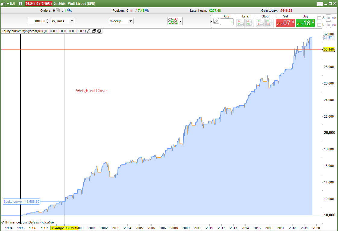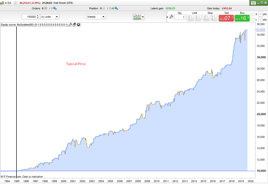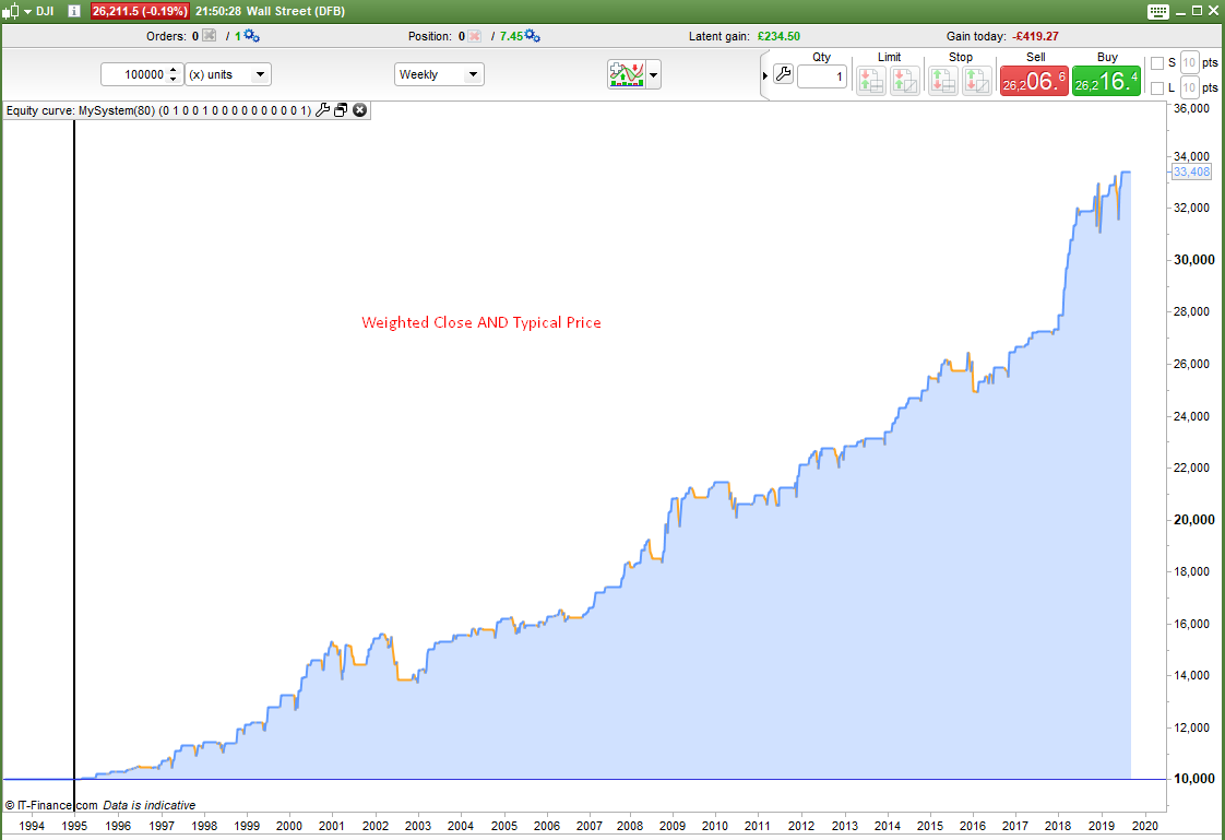 It seems that on the DJI at least the buying on a dip if typical price has dropped or if weighted close has dropped has the best equity curves and especially with the holiday filter on.