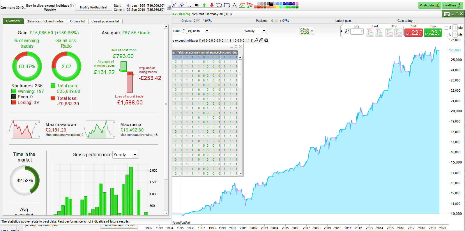 I had a bit more time to do some more testing on the ‘take a holiday’ strategy. I won’t bore you with all the details but I ended up writing various indicators to analyse monthly behaviour and monthly volatility to see if there was some commonality between markets. In the end I coded a strategy that could optimise itself by trading in every combination of months possible to see which combinations came up for each market. If they were all the same or similar then I might be on to something. Unfortunately they weren’t. In the image you can see that the most profitable for the DJI was to avoid trading in January, June, July, August and September and other indices had different best months to avoid. As this ‘pick the best months’ strategy is pure data mining I decided that even though the equity curves were pretty good just taking holidays was not the greatest strategy idea.